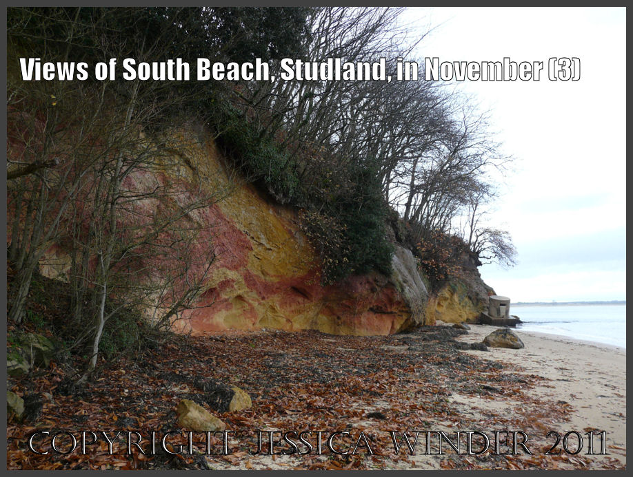Studland Bay beach: The red and yellow iron-bearing sandstone strata in the cliff at South Beach, Studland, Dorset, UK - part of the Jurassic Coast, 27th November 2009 (3)
