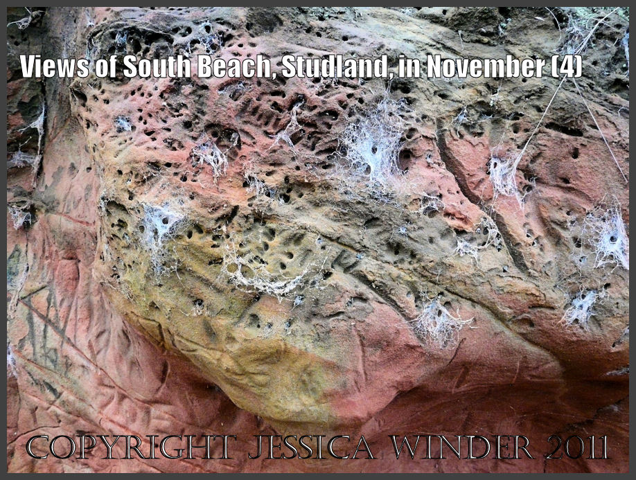 Rock picture: Detail of miner bee burrows and spider cobwebs on red and yellow ferruginous rock in the cliff face at South Beach, Studland, Dorset, UK - part of the Jurassic Coast (4)