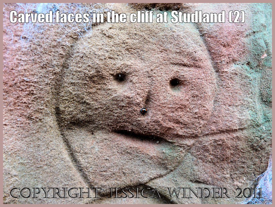 Sad, serious and happy. Three faces carved in the multi-coloured cliff rocks at South Beach, Studland. The colours are natural. The faces amongst many graffiti on these cliffs. But, look again at the middle face…..