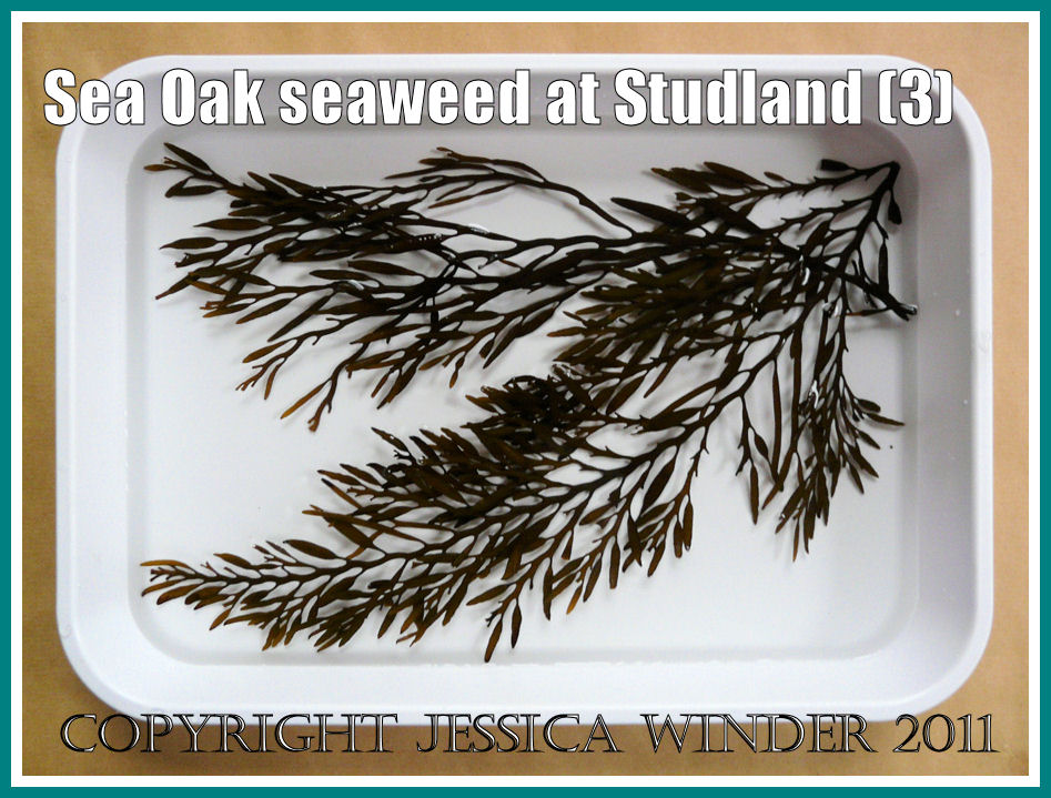 When Sea Oak washes up on the strandline, it is often in a jumbled heap and frequently occurs mixed in with other types of seaweed. You need to pick up the weed and spread it out if you are interested in identifying the different species. That is the only way to clearly see what you have. It lets you examine the whole structure and you may find other interesting seaweeds or small creatures attached to it. Spreading out the alga in water is even more helpful because you can see the natural overall shape and the individual diagnostic features, at the same time as rinsing away the sand sticking to it. Smaller seaweeds destined for herbarium preservation in museums are floated first and then captured in their natural configuration onto paper that is slipped underneath them in the water.