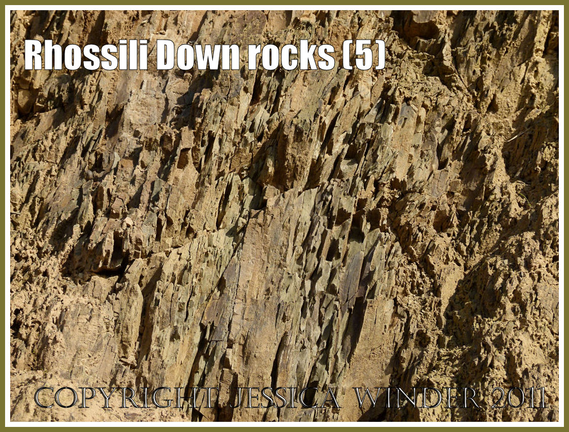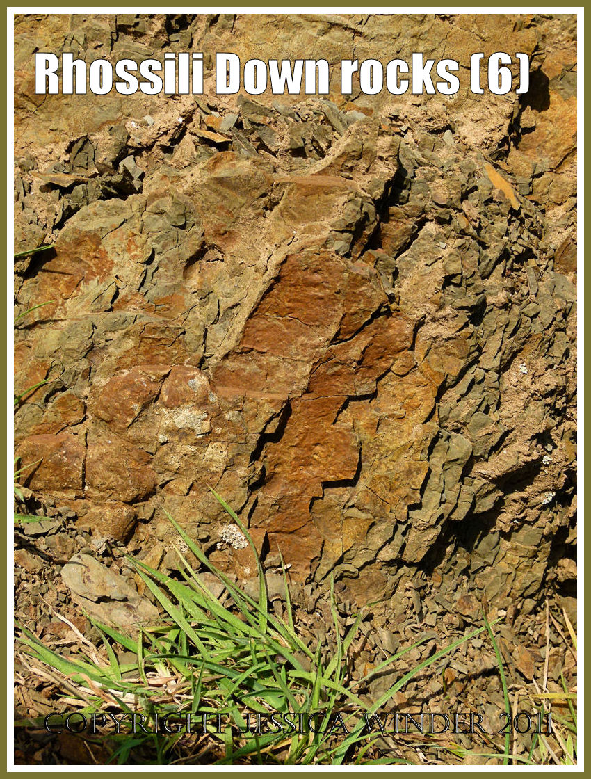 I climbed up to have a closer look at the excavated area. I’m not sure whether it was a quarry or a natural feature. I was surprised to see rocks completely different from any I had seen on the beach as boulders or pebbles. The rock was also very unlike anything I had seen on at either end of the bay from beach level. I know that the headland to the south of the bay, from Rhossili village to Worms Head, and the headland to the north of the bay seen as Spaniard Rocks and the island of Burry Holms, are comprised of Carboniferous limestone rocks.