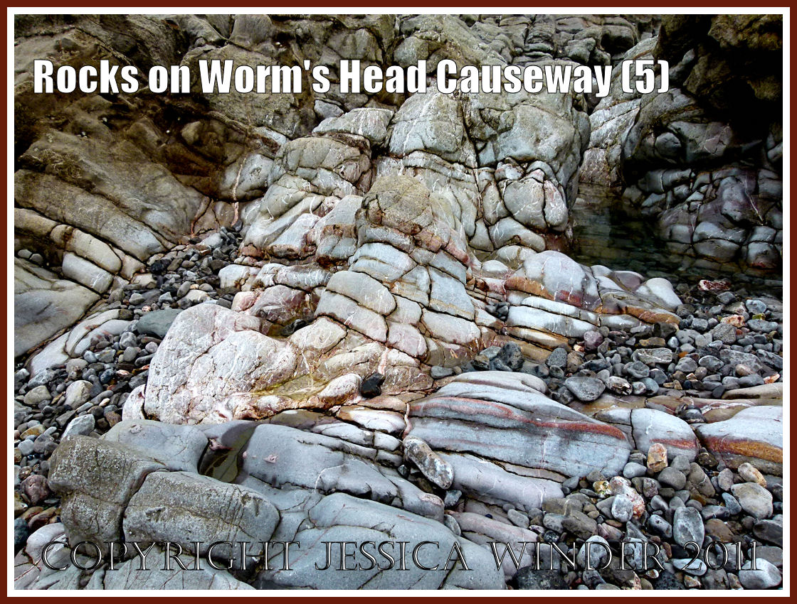 Maybe there is an alternative suggestion for the origin of the red sediments in the limestone fissures, especially where they are not accompanied by calcite crystal. Rather than being an intrusion into the rock by solution from older Devonian rocks below, I wonder if they might be infills of red ochre from younger Triassic rocks which once lay above the Carboniferous Limestone. Complex Triassic sediments, like red ochre, are known to penetrate downwards to infill fissures in the Carboniferous limestone below. This has been recorded in the Port Eynon region further round the Gower coast – although I am unable to find a reference to red ochre occurring in the Causeway rocks.