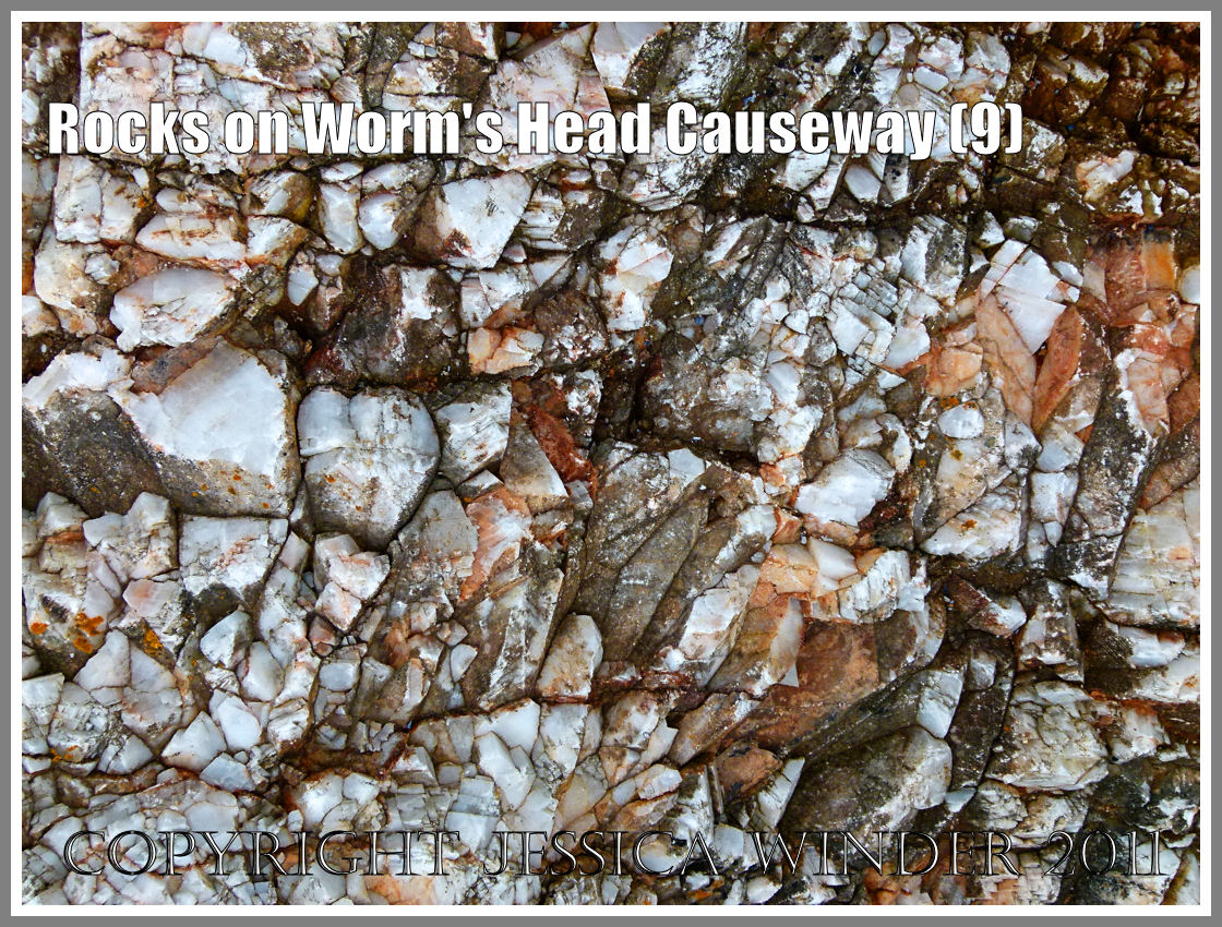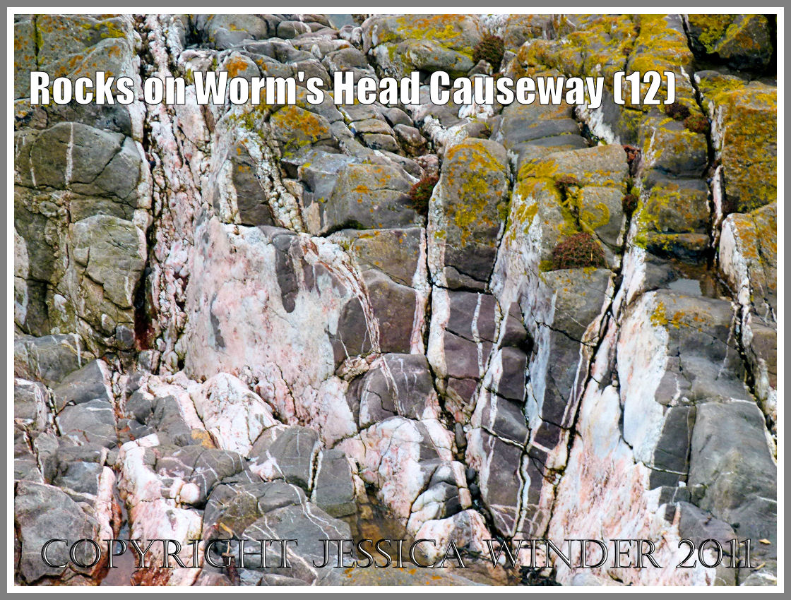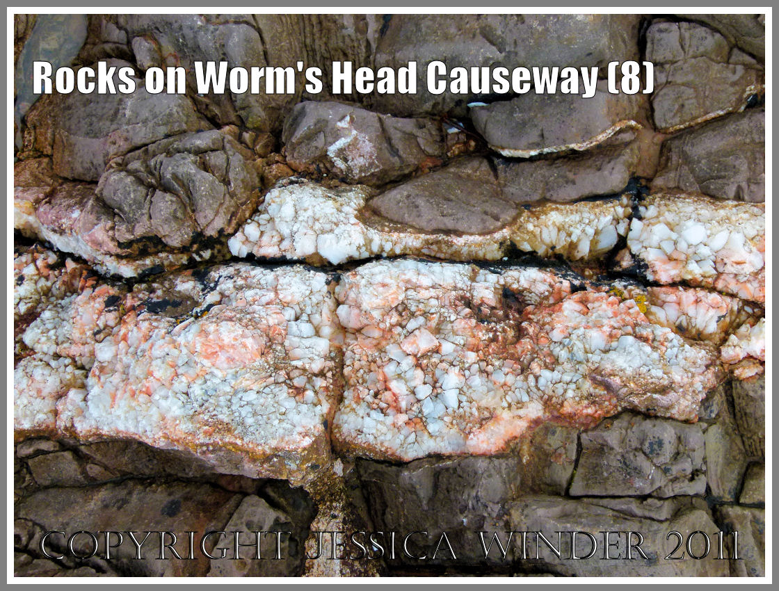 In the previous post in this series Rocks on Worm’s Head Causeway (1), I mentioned that red deposits occur in the cracks and crevices of Carboniferous limestone exposed on the wave cut platform known as the Worm’s Head Causeway in Gower.