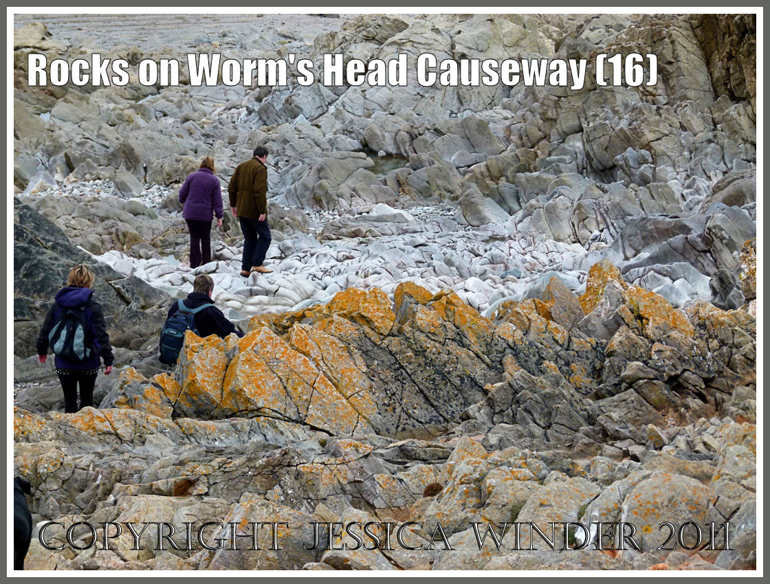 The rocky causeway that separates the headland from the Worm’s Head on the Gower Peninsula presents a dramatic and alien landscape. Close to shore, the sharp and jagged limestone strata thrust up at angles covered with lichens. The lines of orange, yellow and black lichen demarcate distinct areas with varying exposure to wave action, each of which is suitable for colonisation by a particular group of seashore plants and animals – this is known as rocky shore zonation.