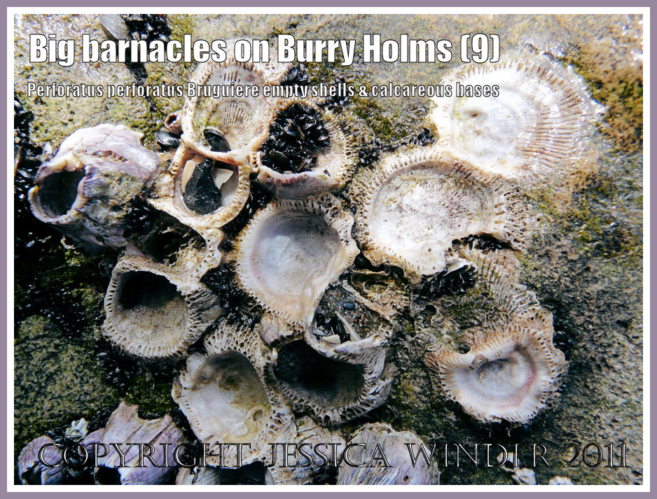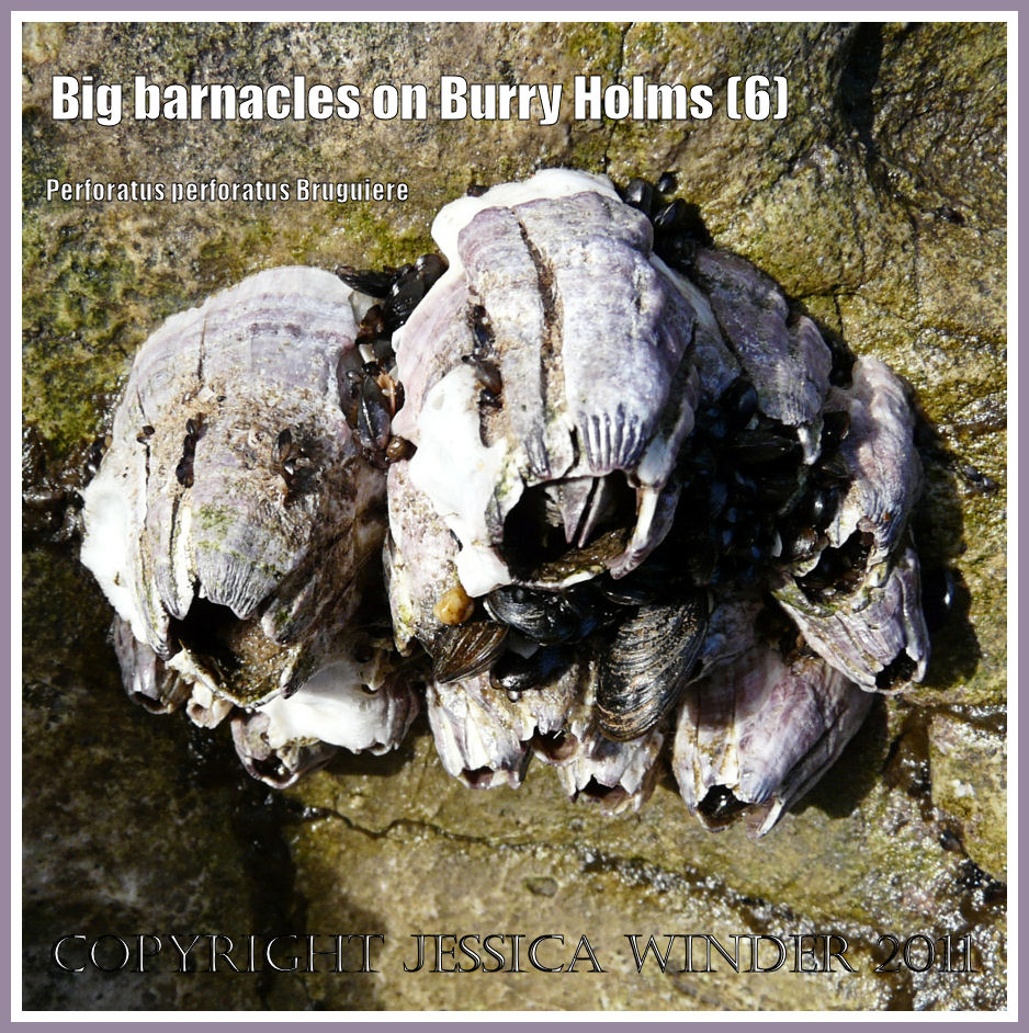 P. perforatus usually occupies the lower half of the intertidal zone but it can extend into the sublittoral to a depth of 40 metres. The specimens in these photographs were exposed at low tide, attached to Carboniferous limestone boulders and the cliff of the island of Burry Holms at Rhossili. They were growing on vertical and overhanging rock surfaces, for upto a metre above the wet sand. They were mostly surrounded by small seed mussels, smaller species of acorn barnacle, and dog whelks predating on them.