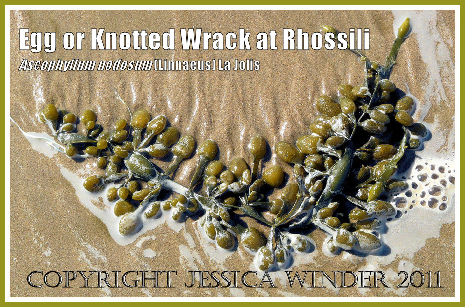 Here a detached frond of egg wrack has been washed up onto the sandy beach. You can clearly see the large egg-shaped air bladders spaced along the central olive-coloured frond which lacks a mid-rib.