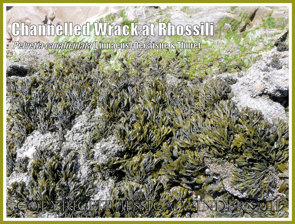 Channelled Wrack, Pelvetia canaliculata (Linnaeus) Decaisne and Thuret, is a much smaller seaweed than the previous two described. It grows in short dense tufts upto 15 cm high attached to rocks just above high water level of neap tides. It is frequently seen dried up and blackened. Black Pygmy Lichen is often mistaken for very small tufts of Channel Wrack.
