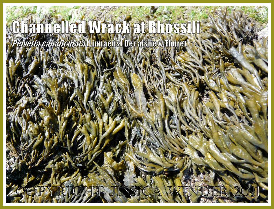 Pelvetia does not have a midrib or gas bladders; the edges of the fronds tend to curl inwards – creating the groove or channel from which it gets its name – but this is not a reliable feature for identification. The fruiting bodies are irregular shaped, swollen, forked ends to the fronds.