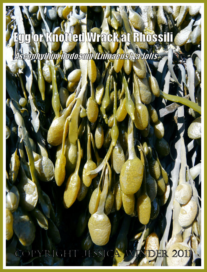 Looking like bunches of flattened yellow sultanas hanging down on stalks, the reproductive bodies of the Egg or Knotted Wrack, Ascophyllum nodosum ( Linnaeus) La Jolis, were a very noticeable feature of the weed in April. This picture was taken of the seaweed attached to the limestone of Spaniard Rocks, adjacent to the causeway separating the mainland from Burry Holms, on Rhossili Bay.