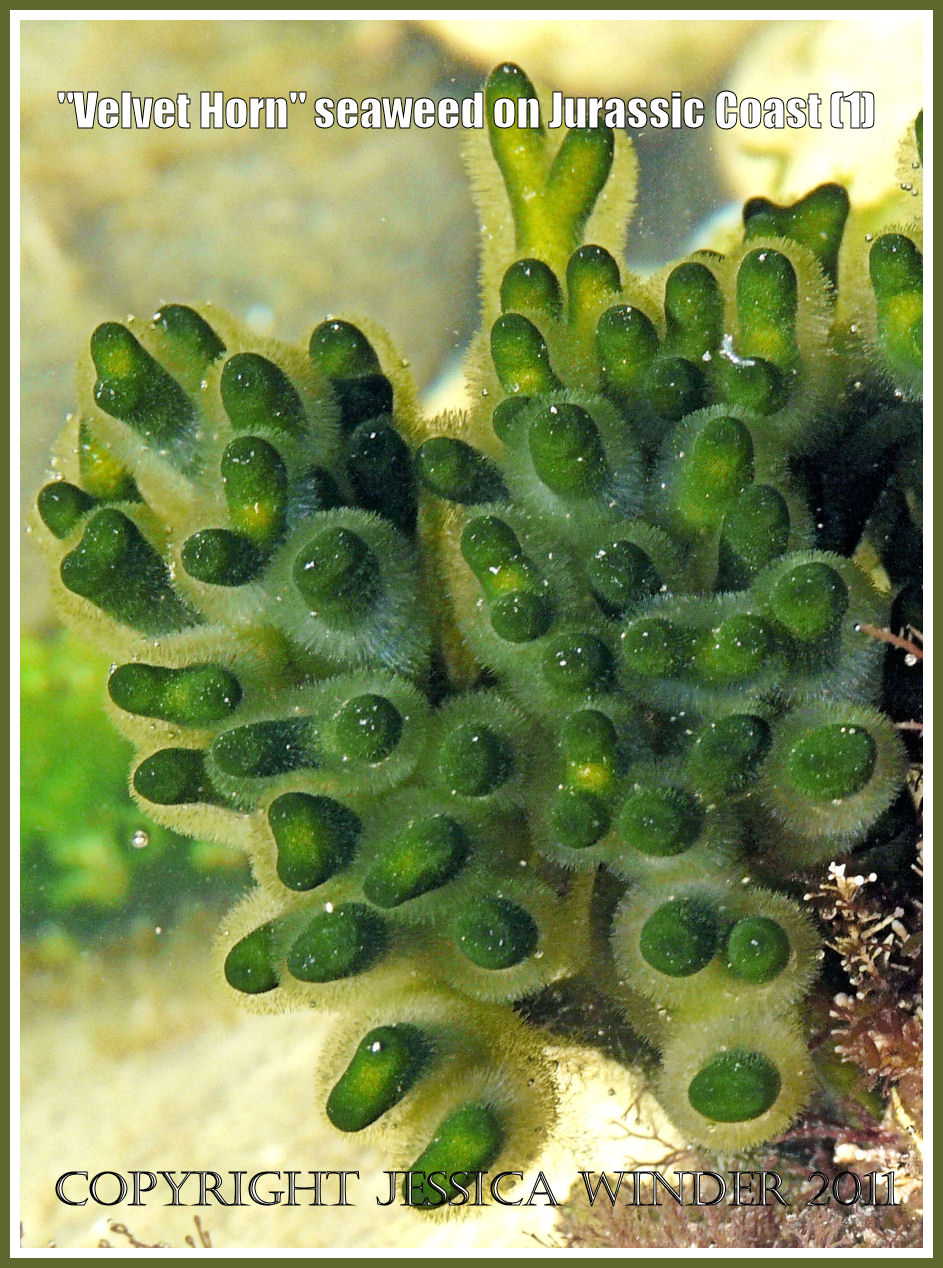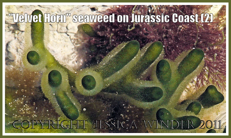 * N.B. Since I first wrote this post, I have been back to the site and obtained a small piece of the seaweed. I have now examined it microscopically and can confirm that the specimen from which I took the sample is not C. tomentosum (the rare species) but C. fragile. In technical terms, the filament-bearing utricles are mucronate (with a small sharp point at the end) and not rounded. I found many more Velvet Horns exhibiting a range of variation on my second visit and I cannot rule out that the rarer species may have been present as well but not sampled.