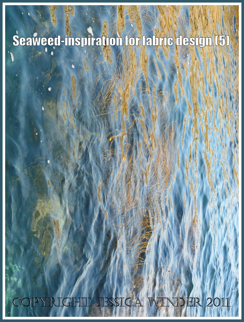 I have lots of photographs of seaweed in water. I wondered if I had any images in my collection that might reflect that kind of inspirational subject. I came up with the following pictures – all showing Thongweed floating in the sea just offshore from Winspit in Dorset. The long strands of pale olive coloured seaweed were being flicked and drawn, to and fro, by the undulating waves. I thought the photographs were a good approximation of the idea being captured by the textile designer.