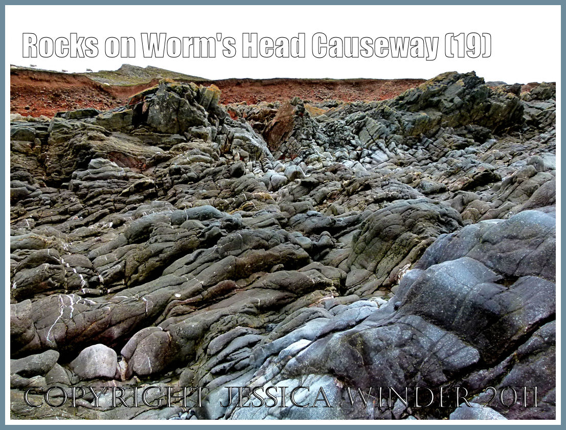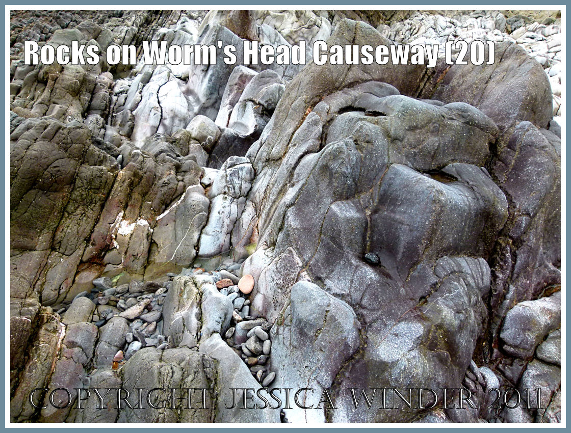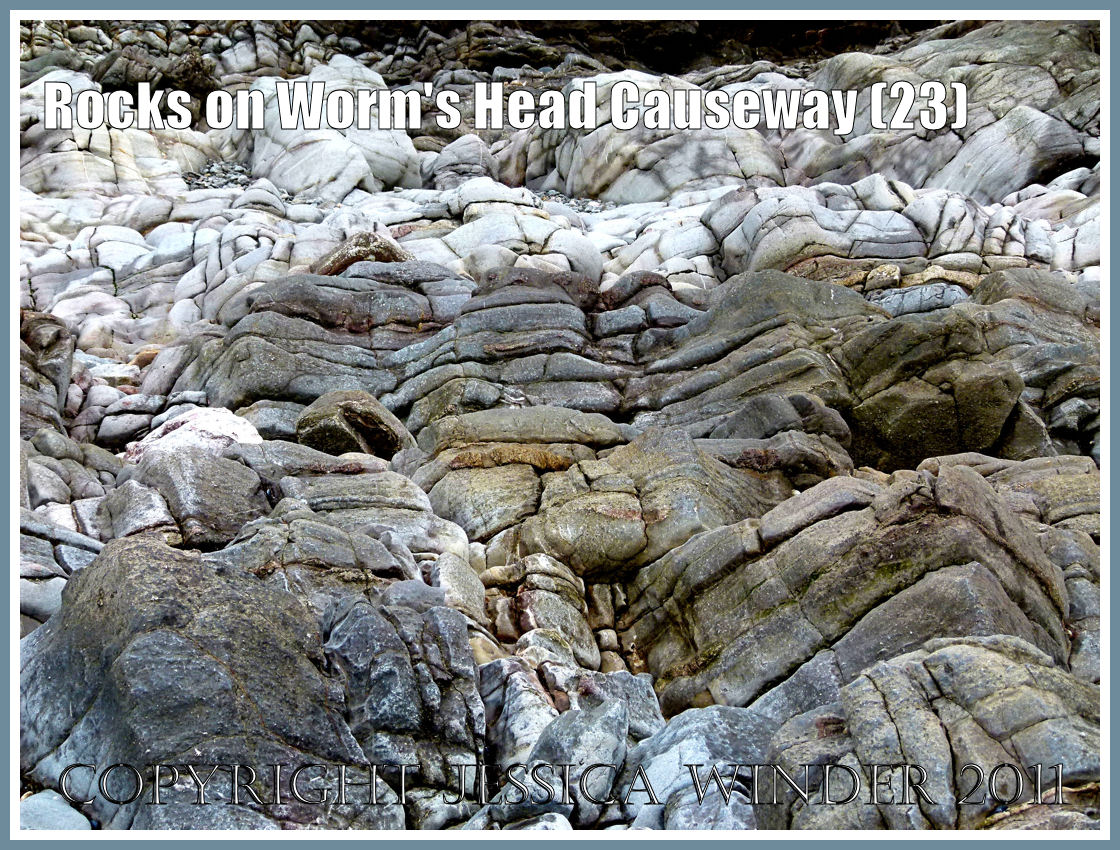 In the earlier post Rocks on Worm’s Head Causeway (3), the photographs illustrated the sharp, jagged nature of the protruding inclined rows of limestone that outcropped close to the shore. However, further out on the causeway, the rocks have developed a softer outline and smoother surface texture where the waves and their pebble load have worn away the rough edges of the stone. The wear is not even for each exposed layer of Carboniferous limestone. Some strata are composed of materials in such a way as to be either easier or more resistant to weathering and erosion.