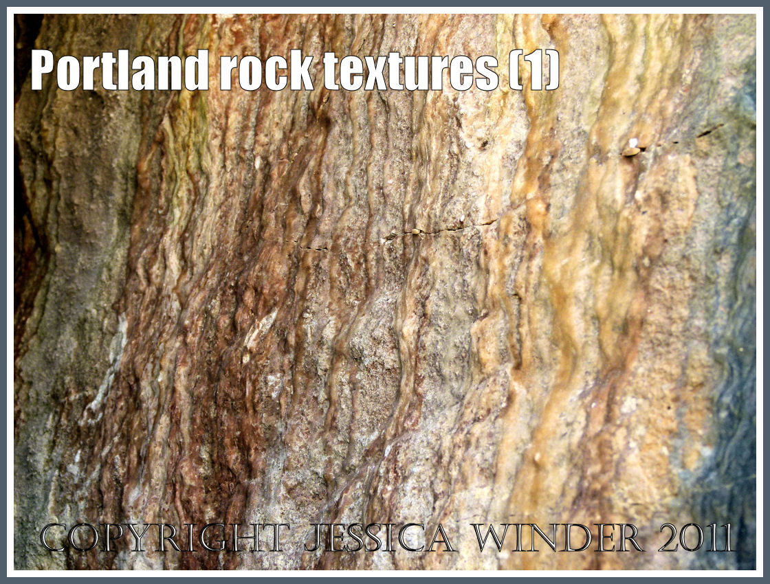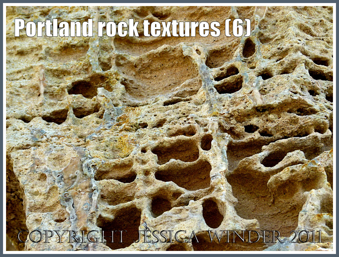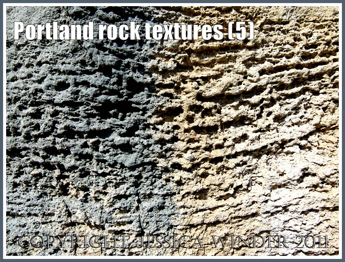 These photographs show some of the rock textures to be found along the coastal path from Freshwater Bay to Portland Bill on the east side of the Isle of Portland in Dorset. The rocks are coloured and patterned with hues of grey, black, cream and orange, some with an amorphous surface coating of precipitated crystal, some bare – just as first exposed by the quarrying. Some rocks have smooth textures. Others, are veined and varicose. Occasionally, rock surfaces resemble interwoven tears like the cooling wax that dribbled from a giant guttering candle. The surfaces can be rough, knobbley and striated – looking like they have been knitted in purl stitches. While in other places, the rock surfaces seem to have been unequally weathered by the elements to create hollows in a honey-comb texture.