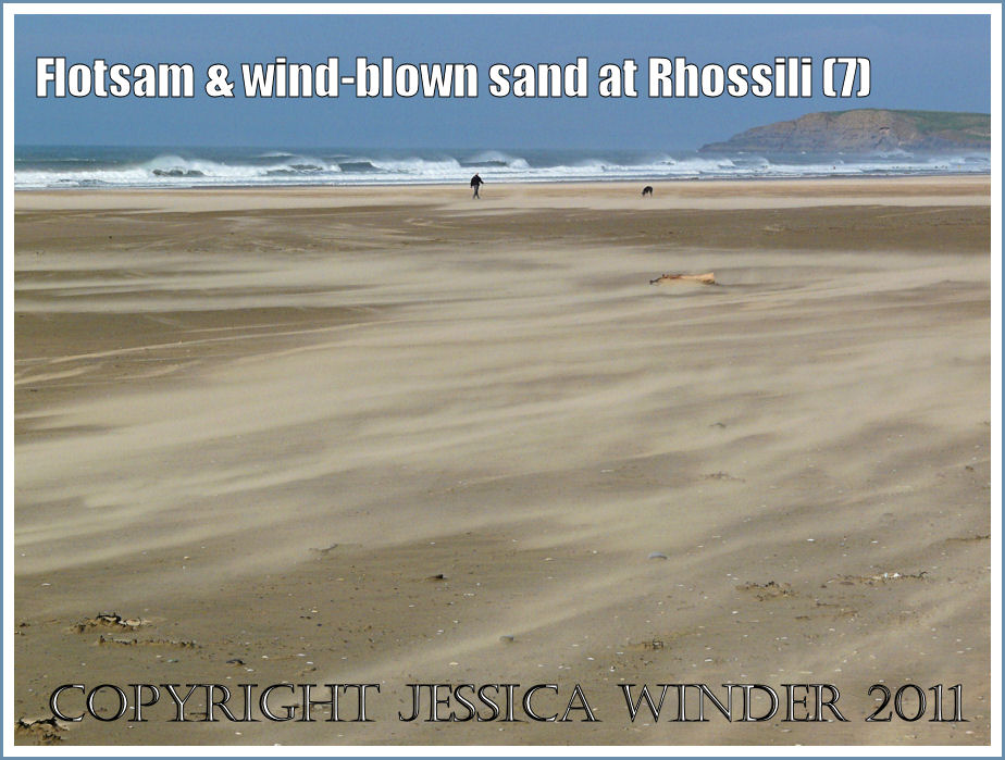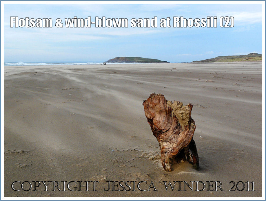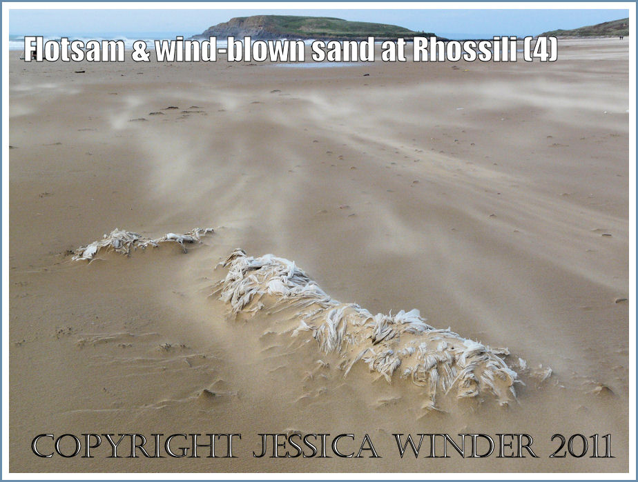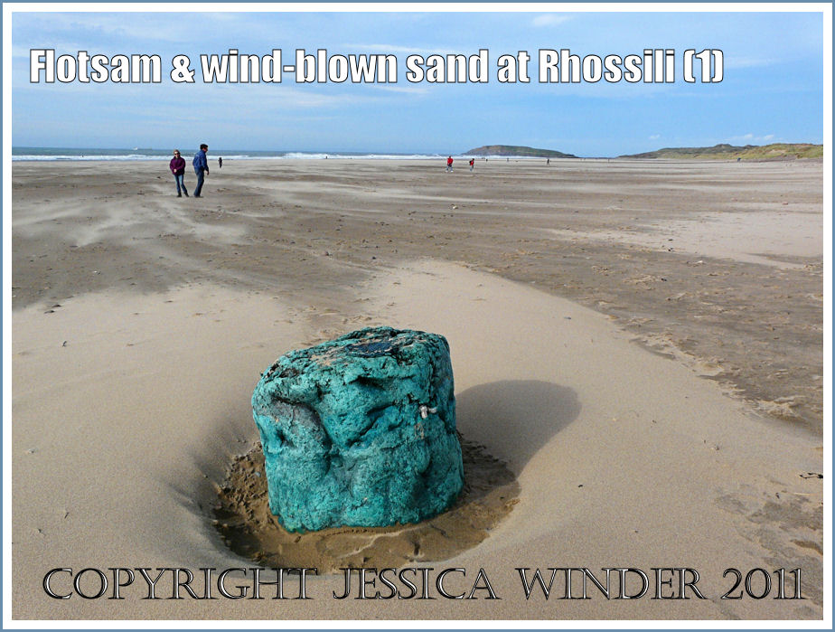 All sorts of flotsam washes ashore at Rhossili Bay – some from thousands of miles away. Here are a few of the things that were found one sunny autumn day when the biting wind whipped the sand across the shore in fast moving low drifts. This selection includes a solid cylinder of bright green melted fishing nets shaped like the oil drum they were burnt in; a piece of driftwood from the ancient submerged forest in the Bristol Channel; a tattered old blue and black lobster pot; metres and metres of white polythene sheeting; green, orange, blue and yellow fishing nets and ropes in a heap; and a vivid pink and black ship’s buoy.