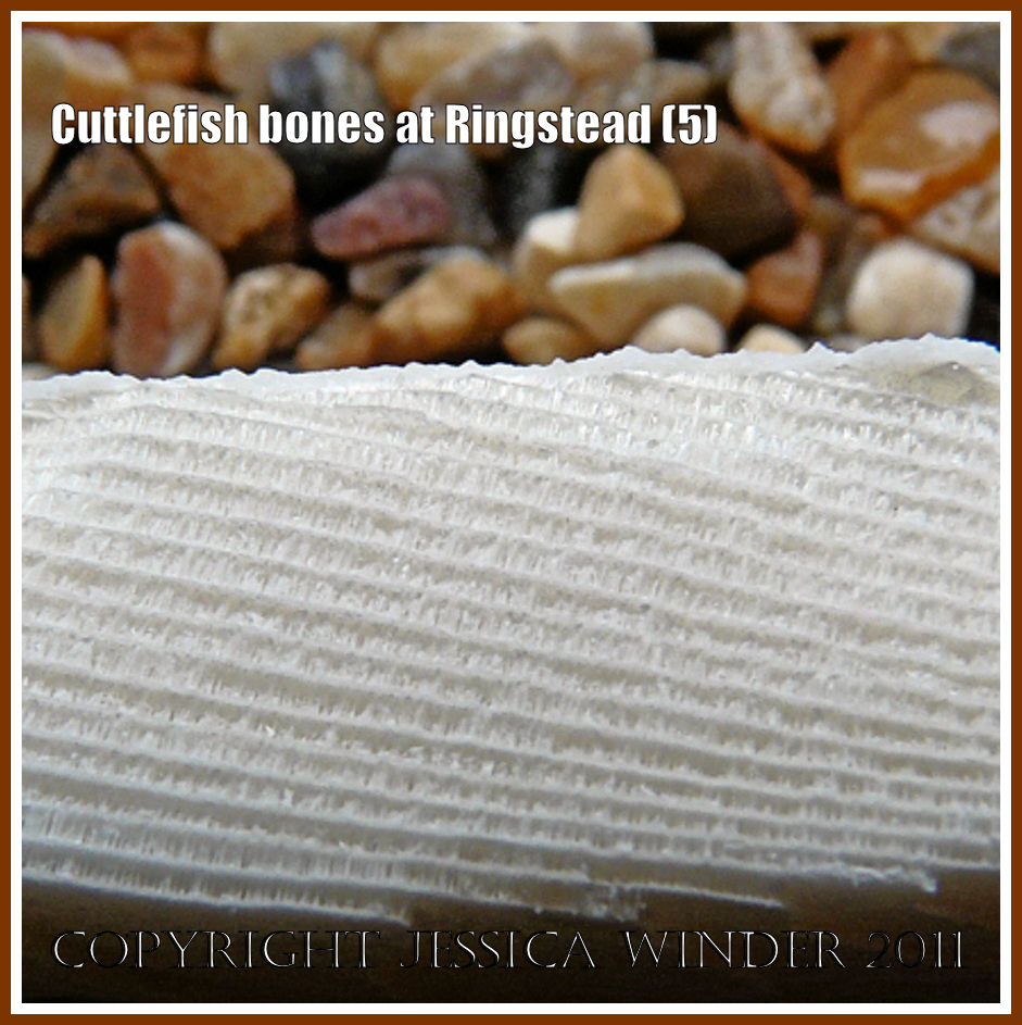 I was fascinated to also find the unusually marked cuttlebone shown above on the shingle at Ringstead. It looks as if, at some stage in its life, the bone had been virtually broken in half but that it had healed and the animal survived. Perhaps it had sustained this substantial damage from a predator trying to bite through it?
