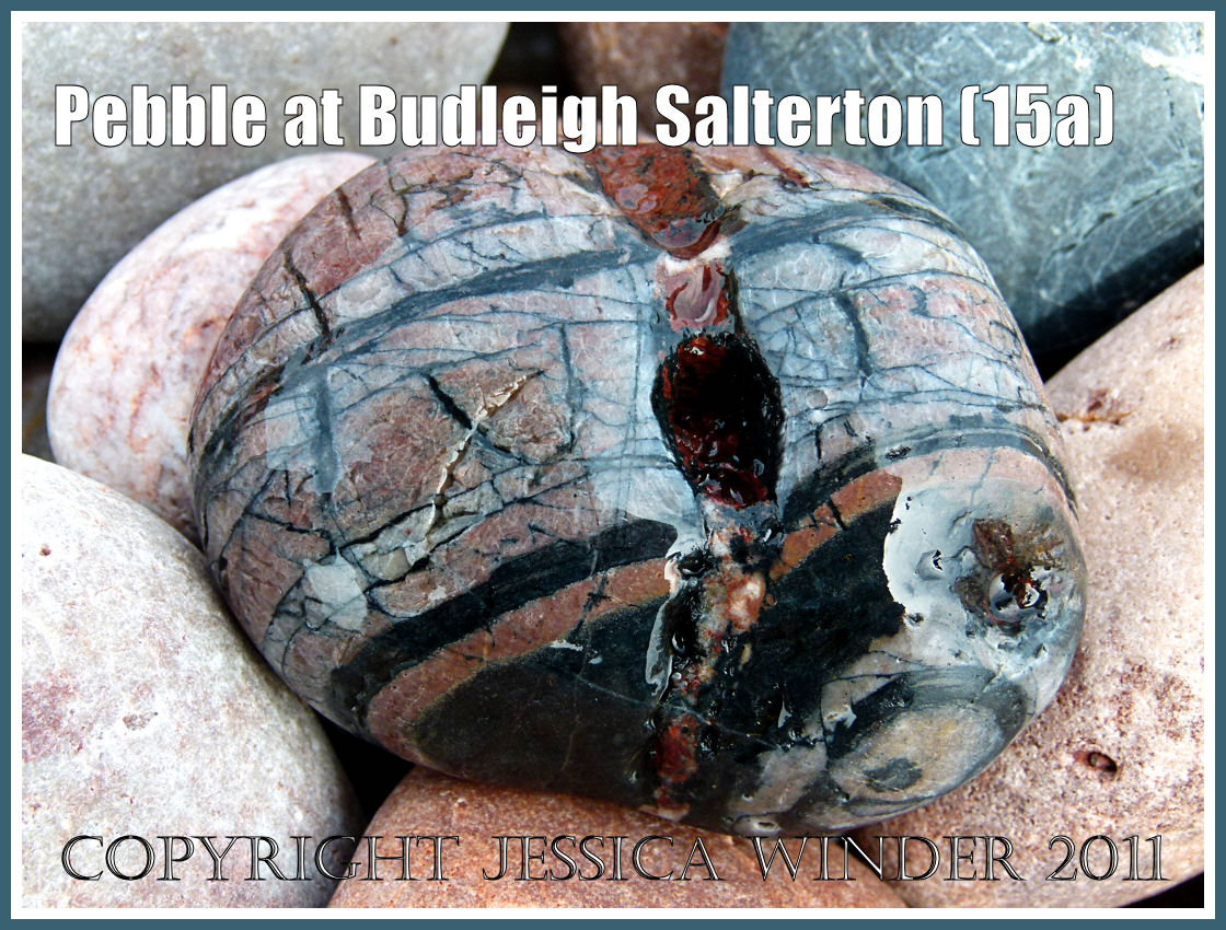 Here is a particularly interesting pebble that I photographed from various angles on the beach at Budleigh Salterton in Devon on the Jurassic Coast World Heritage Site in the U.K. I am not exactly sure what it is but it in all probability came from the pebble beds in the nearby cliffs that were laid down in the Triassic period. The Triassic period lasted from 225 to 180 million years ago. The pebbles themselves are mainly quartzite and were brought to this Devon location by a large river flowing out of a mountainous region in France. These French mountains, and therefore the pebbles derived from them, were composed of rock laid down in the much earlier Ordovician period which lasted from 500 to 440 million years ago. So the sediments of which the pebbles are composed may actually be twice as old as the pebble beds in which they are found.