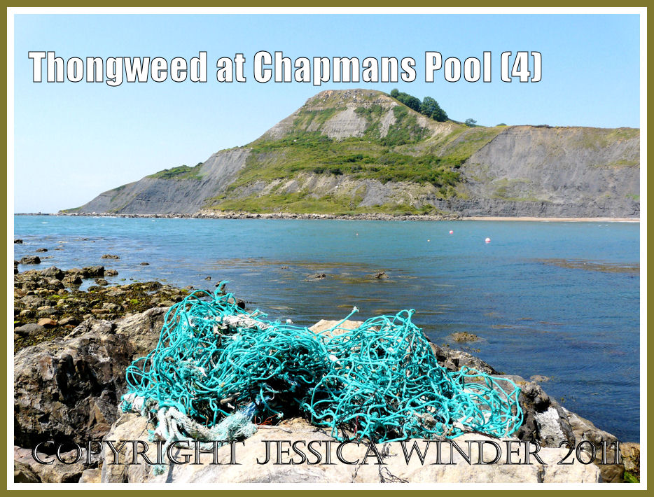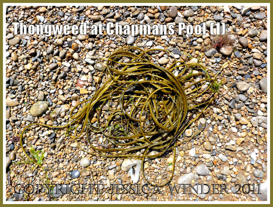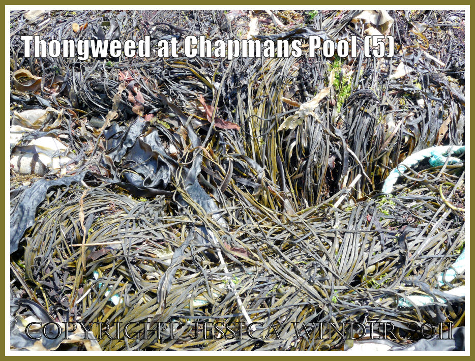 In the photograph below, the Thongweed has been washed up in a mass and is drying out on the strandline of a cobble and boulder strewn rocky shore in the southeast part of Chapmans Pool.
