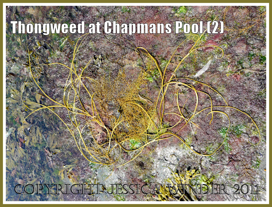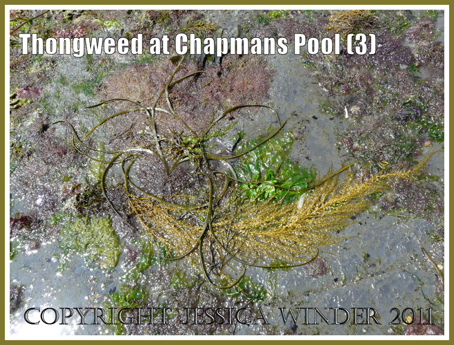 Long narrow straps of Thongweed with a plume of golden Japweed, bright green Sea Lettuce and assorted red algae on a rock platform at Chapmans Pool.