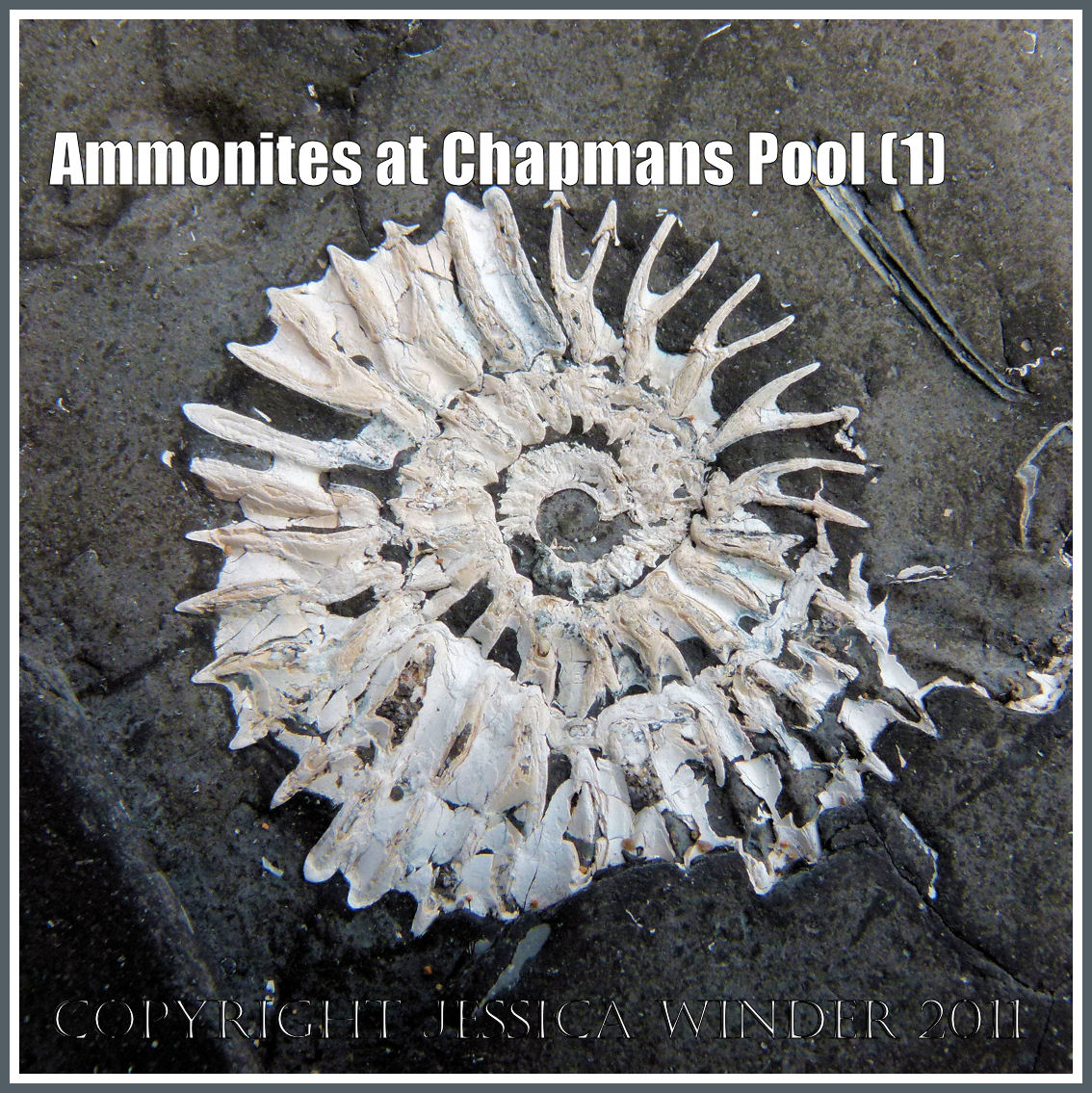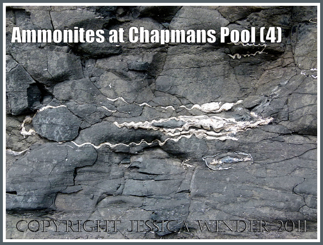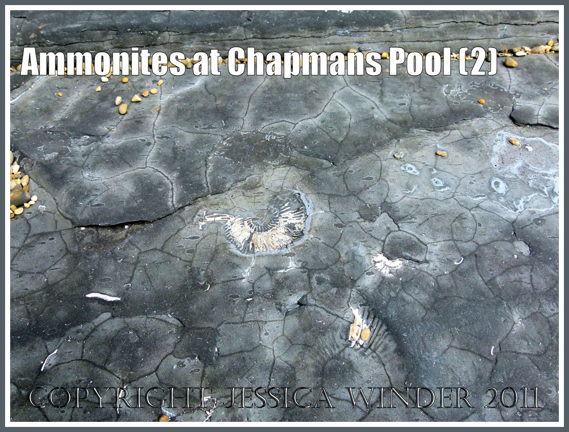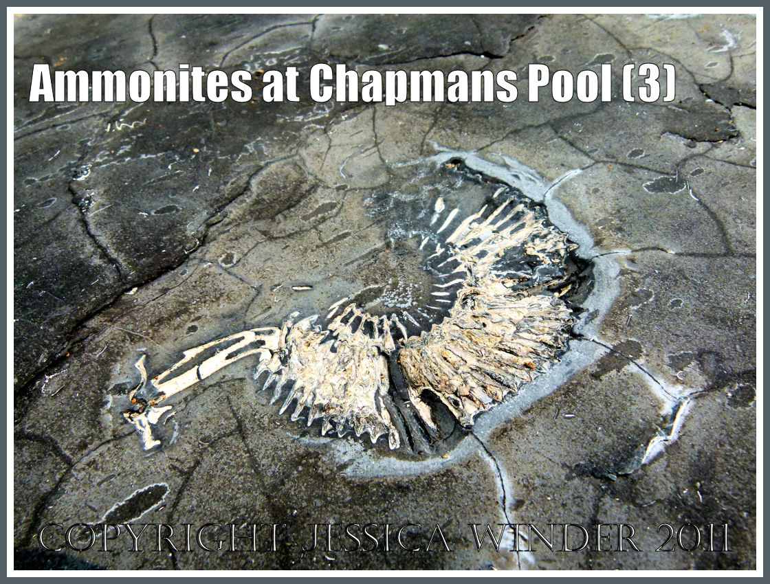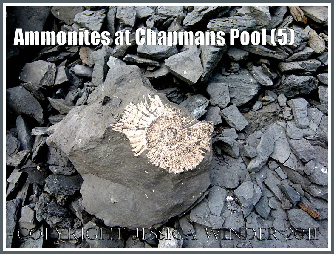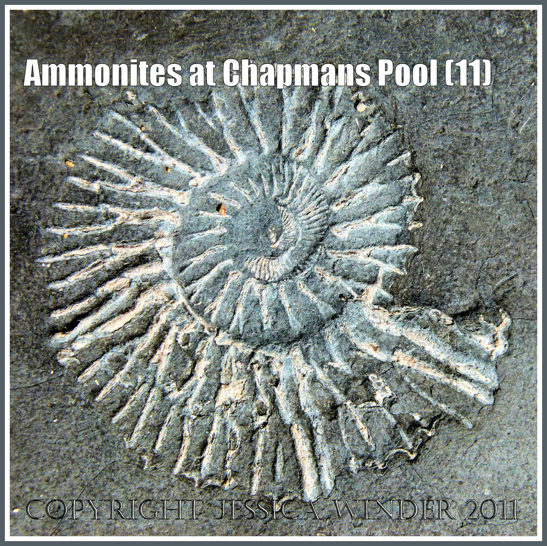 There is one type of fossil that you are more likely to find than any other at Chapmans Pool in Dorset, UK – and that is the ammonite – possibly Pavlovia rotunda or maybe even Pavlovia pallasiodes. These are fossil cephalopods dating from the Jurassic Period. The shelly remains of many thousands of these were buried in sediments that were later compressed into rocks – the so called Rotunda Shales – which are part of the series of marls, shales and clays known as the Kimmeridge Clay that was formed during the Upper Jurassic Period over 135 million years ago.