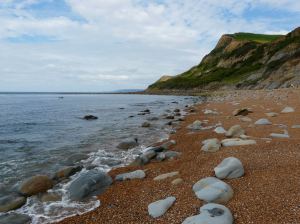P1100797a A view looking west towards the rocky end of the beach at Eype, Dorset, UK – part of the Jurassic Coast – showing boulders amongst the shingle and in the shallow sea at the water’s edge (8)