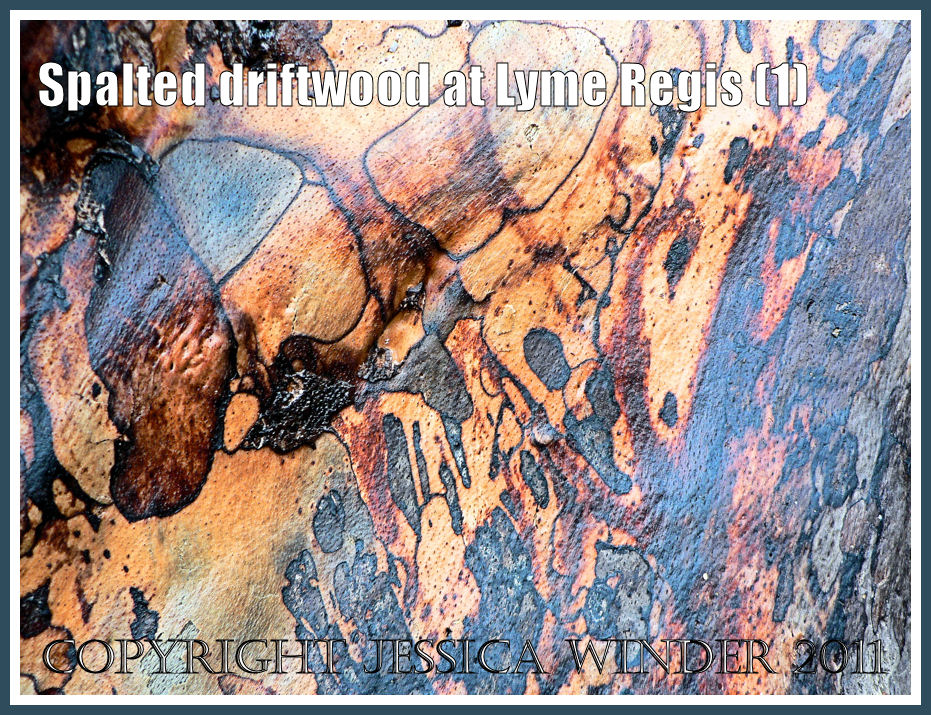 You get massive tree trunks washed up at Monmouth Beach, Lyme Regis, Dorset. I discovered these patterns on the waterlogged timber of just such a huge piece of driftwood. The prolonged immersion in seawater had waterlogged the wood and the natural colours were enhanced by the wetness, The bark was mostly peeled away. The texture of the underlying wood was smooth. The combination of pores, grain, and black lines caused by the spalting fungal infection, made the trunk and branches look like weirdly stiffened limbs covered with abstract tatoos.