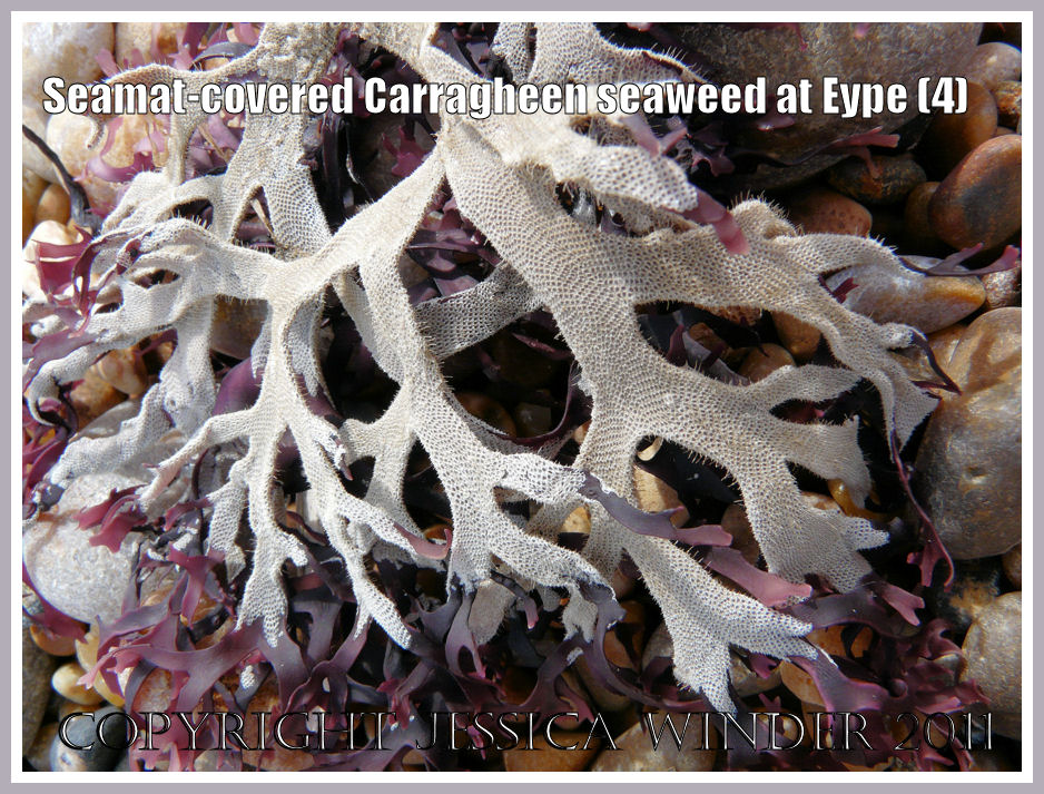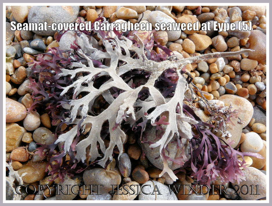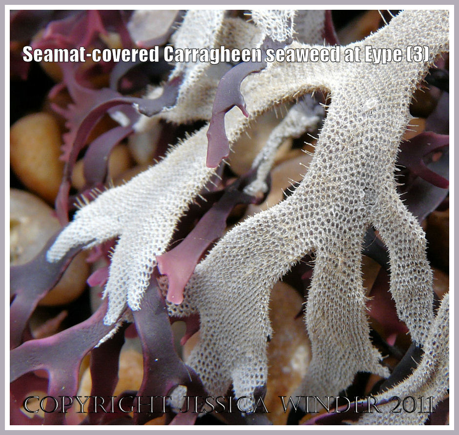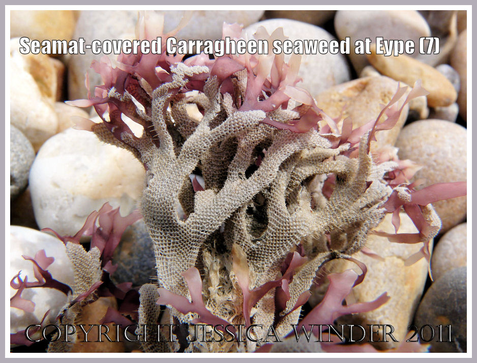 Less well known it the common association between Irish Moss and the Seamat called Electra pilosa (Linnaeus). You can see this in the photographs here as a white, lacey layer that decorates the red fronds of the seaweed. Each cell of the ‘lace’ is a small box in which the Bryozoan animal lived. Under a microscope every box can be seen to have a distinctive shape with small projecting spines that is unique to the species. Some of these spines extend into long spikes that are clearly visible even to the naked eye.