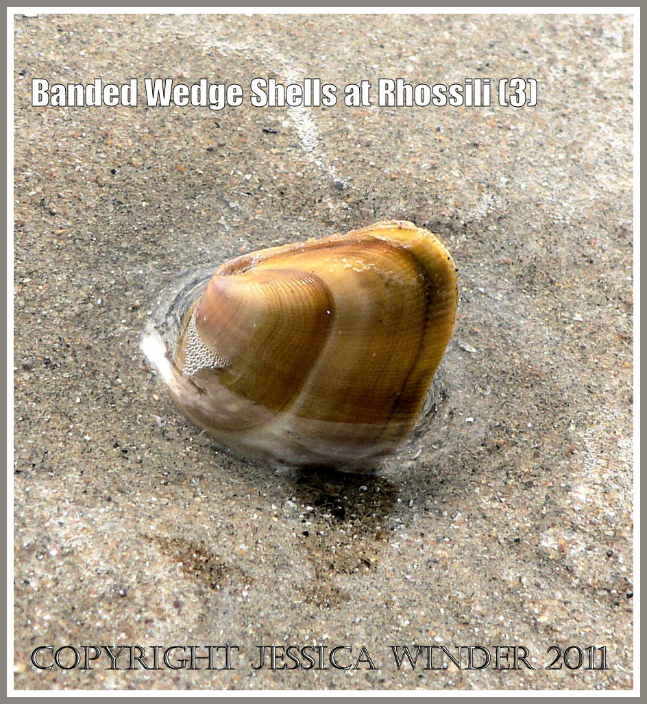 Banded Wedge Shell: A living Banded Wedge Shell part-buried in wet sand at low tide level at Rhossili, Gower, South Wales.