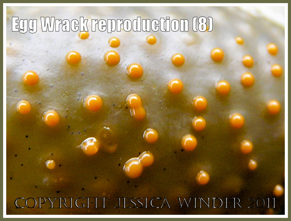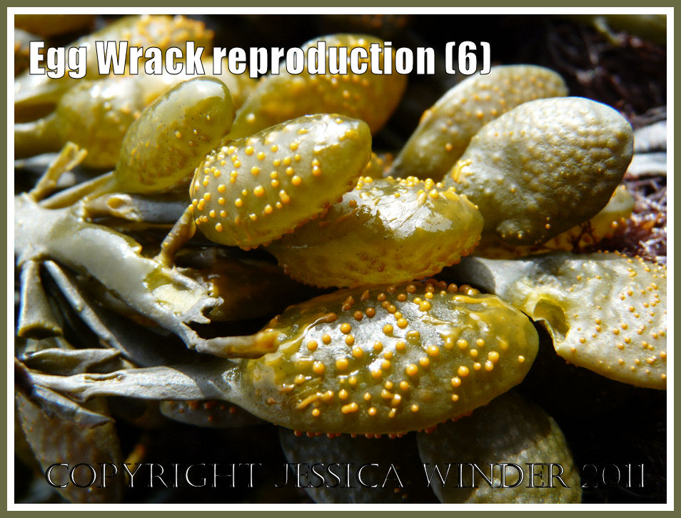 What I was fortunate enough to witness was the moment immediately prior to the synchronised release of the reproductive products from the mature specimens of Egg Wrack (plants reach maturity over a five year period and can live from 10 to 20 years). The receptacles take from 12 to 14 months to ripen. The photographs here show the small swollen yellow conceptacles glistening on the surface of the receptacles – resembling minute yellow blisters. These burst when touched. The yellow liquid containing the gametes formed a wet coating over some of the plants and stained my hands like nicotin where I had handled the fronds. The incoming tide was just seconds away as I took these shots, my outstreched feet behind me getting wet as I positioned myself low enough to capture the moment that the pustules started to burst.
