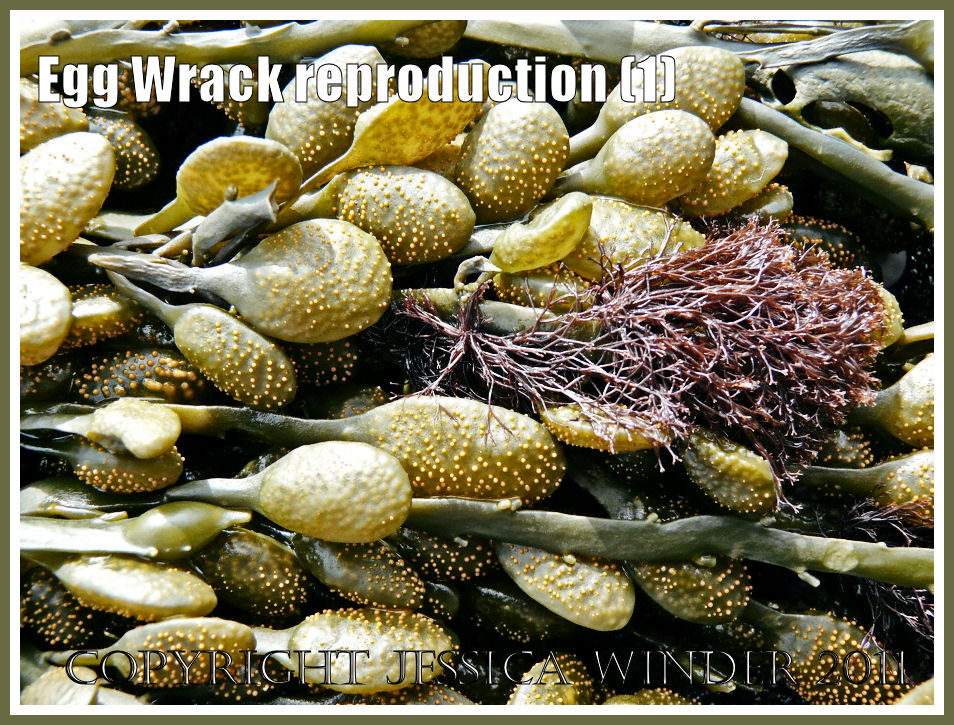 Sexual reproduction in Egg Wrack and other Fucoids is oogamous, meaning that the eggs are released from the parent plant before fertilisation. Fertilisation takes place in the surrounding seawater. The eggs and the antherozoids are released into the water at the same time. The activity is synchronised. The antherozoids can swim. They have two minute flagellae attached to the side of the cell that move the cell along by a whip-like action. The egg is non-motile but has enough buoyancy to remain suspended in the water rather than sinking to the sea bed.