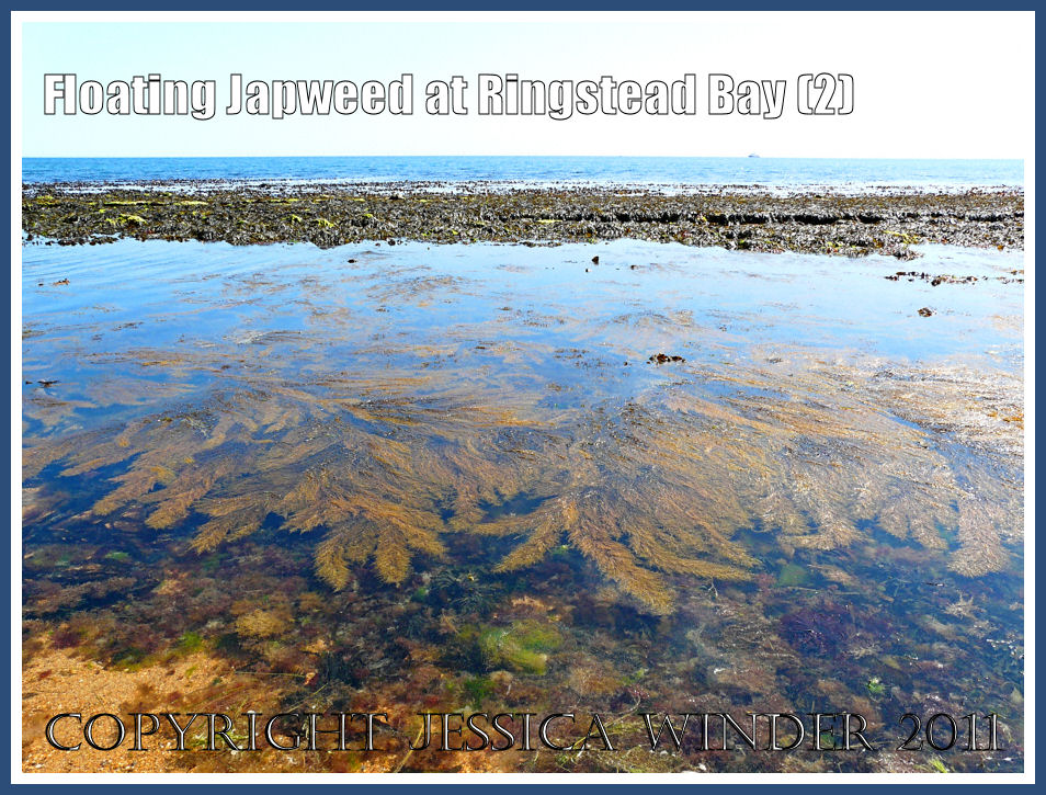Looking like a wonderful blue carpet with a golden fern pattern, Japweed Sargassum muticum (Yendo) Fensholt, was particularly decorative at Ringstead Bay in Dorset one hot July day. Here are some photographs of this alien species of seaweed floating near the surface in still, shallow water near the beach. The yellow-green fronds contrast well with the deep reflected blue from the cloudless sky above. Sometimes other types of red and green algae can be seen through the clear water on the seabed below; and brown fucoids are visible in above the water surface on the rocky platform just offshore.