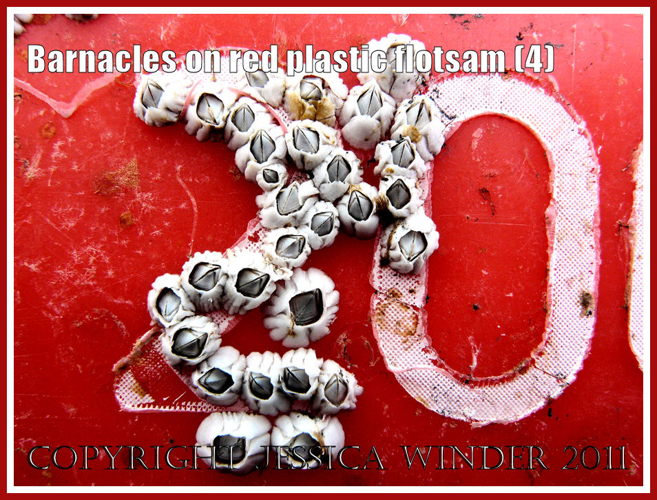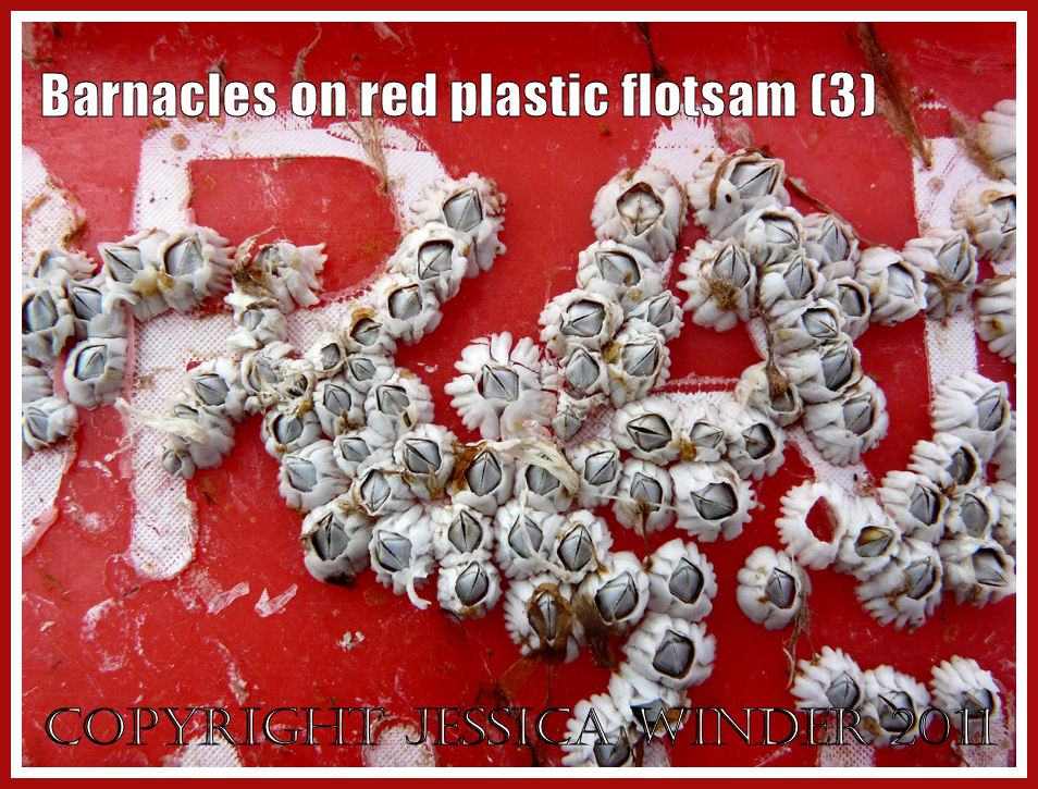 This acorn barnacle with its six-plated shell was one of many that were attached to a red plastic fishing crate washed up on the pebbles of Chesil Beach, Dorset, UK on the Jurassic Coast. The crate was marked “Ladram Bay Trawlers 2005”. The barnacles seemed to have a preference for settling on the roughened surfaces where the white letters had been attached. as you can see in the pictures below.