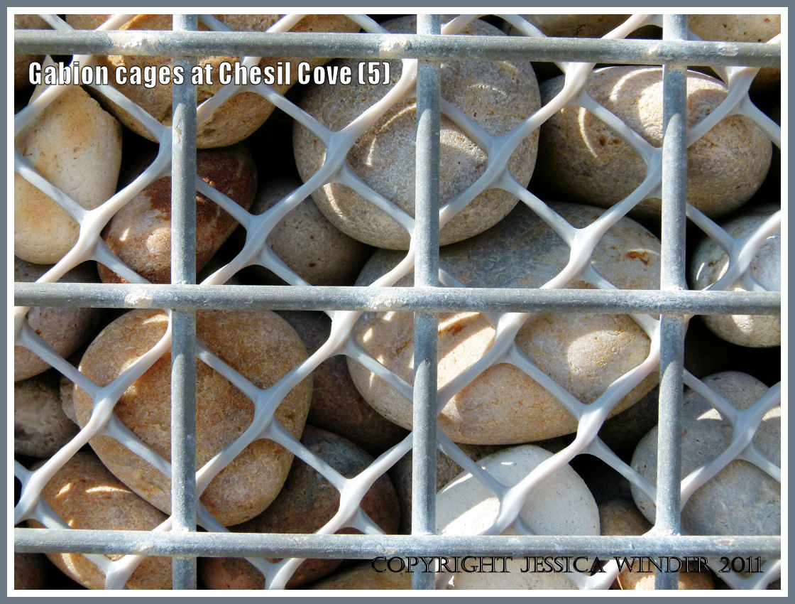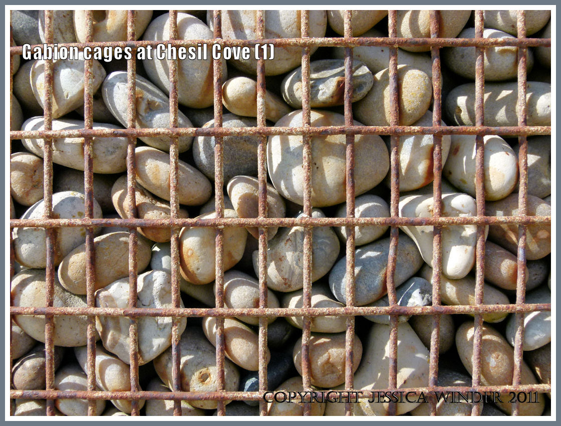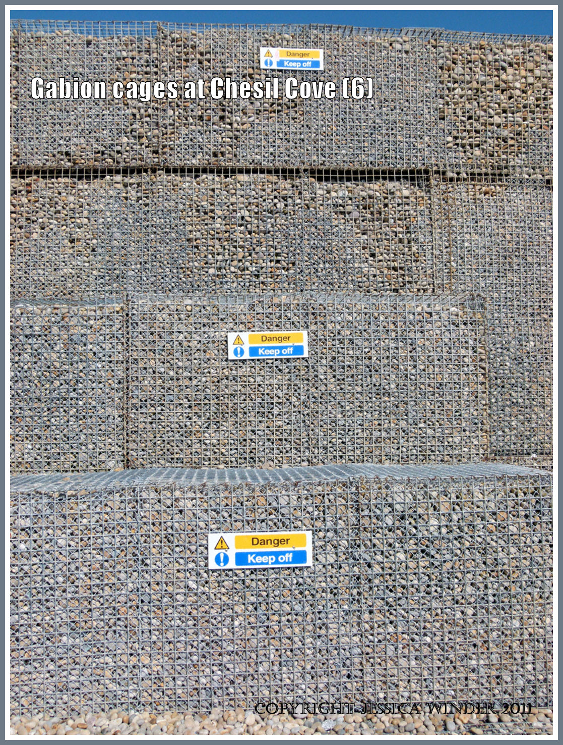 The term ‘gabion’ was traditionally used to describe a cylindrical wicker basket, usually open at both ends, and filled with earth for use in fortifications and engineering; and it is said to date back to times of medieval warfare. The word is now still used to describe a fortifying and defensive structure but is more typically made like the ones illustrated in these photographs – although the contents of the cages may vary – and is more generally seen in use to minimise the ravages of natural processes.