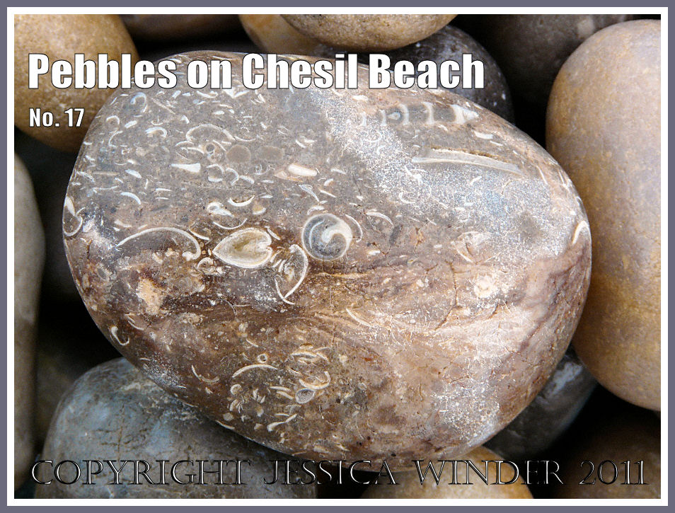 Pebble with fossil seashells on Chesil Beach at Chesil Cove, Isle of Portland, Dorset, UK, on the Jurassic Coast (3)