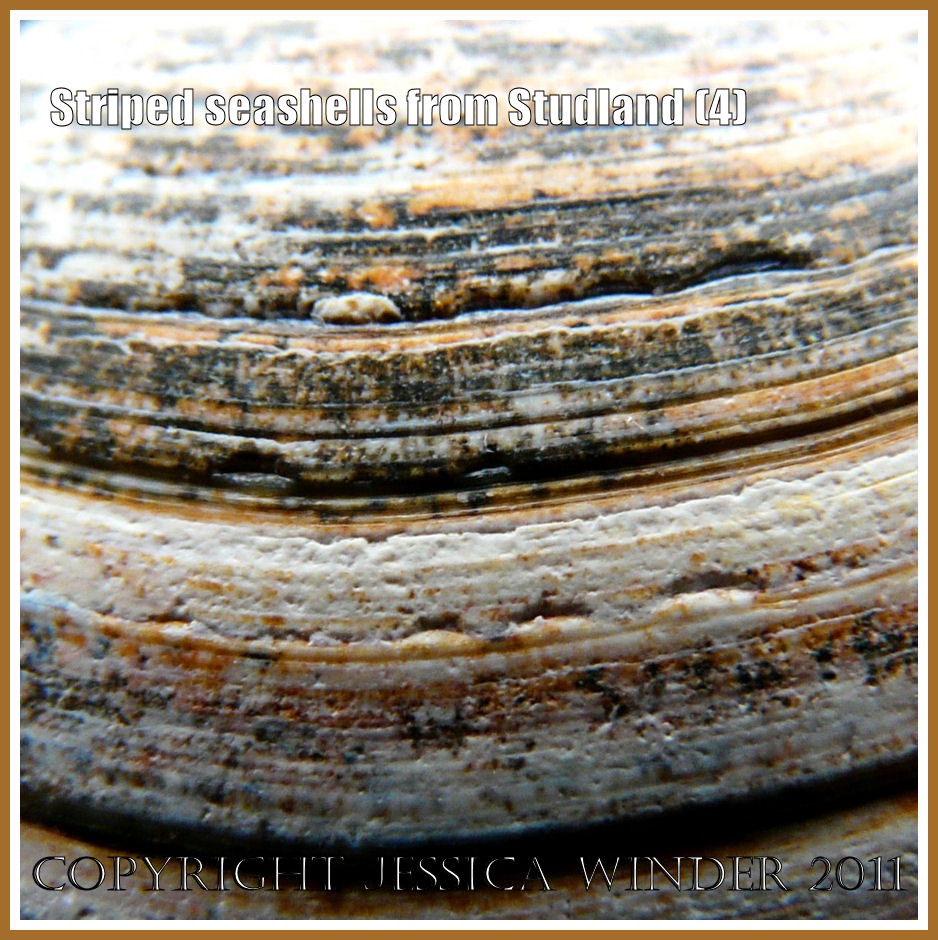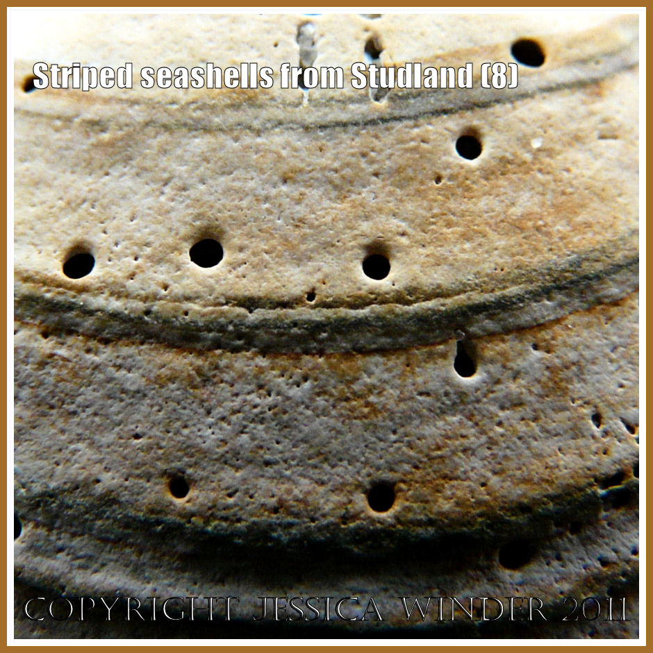 A shell is likely to be buried many times. Beach sediments can be very mobile. We tend to think of shells on the seashore as being fairly recent in origin. However, there is some suggestion that the more robust shells can be over a hundred years old. There is certainly a wide range in the degree of erosion in these striped shells – as you can see from the close-up photographs below.