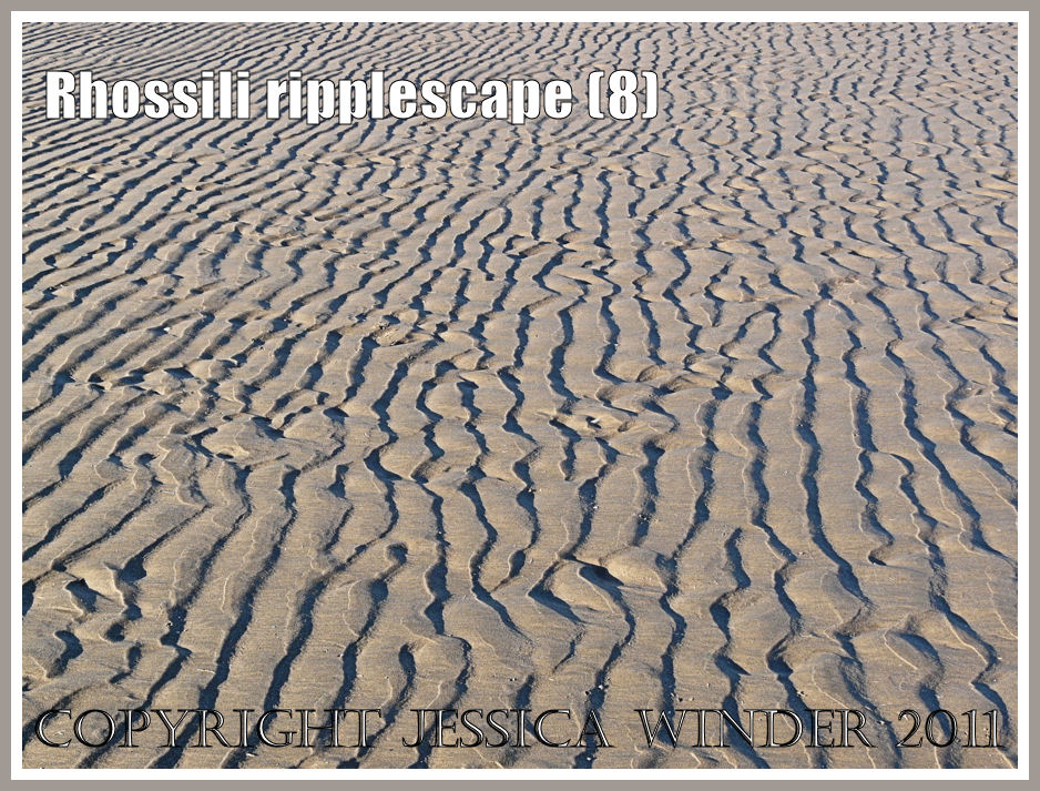 Here are some more of the fascinating sand ripple patterns that I noticed on Rhossili Beach one winter’s day. The amplitude of the ripples, the sharpness of the ridges, the layout and design of these wave-created patterns changed from one part of the beach to another. I would really like to understand exactly what factors influence the making of this infinitely variable, miniature and temporary, natural beach architecture.