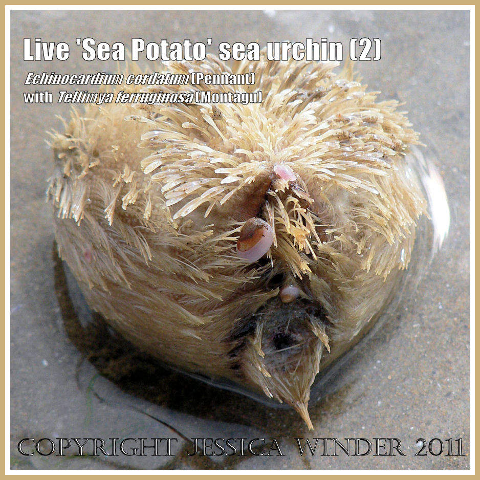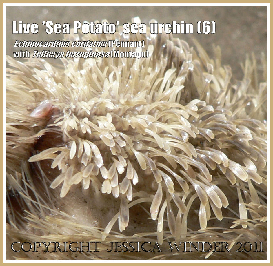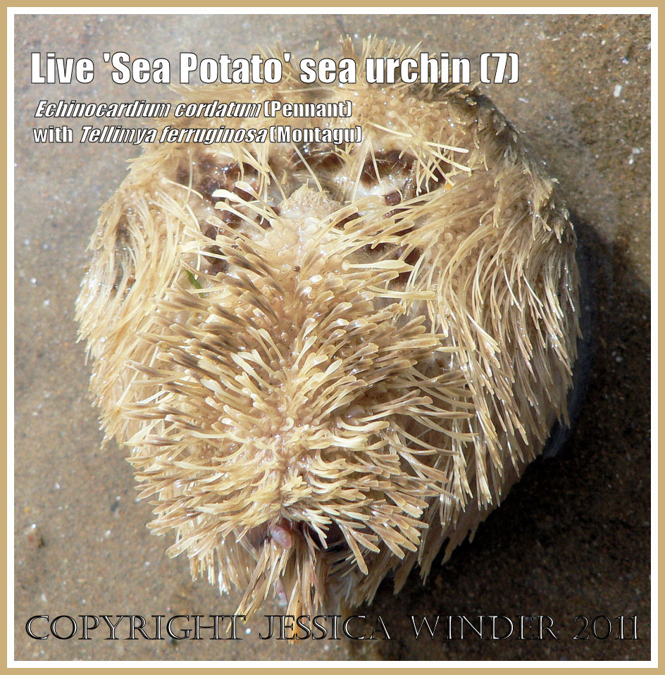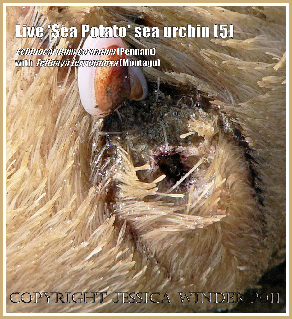 In several of these photographs you can see some small pink bivalved molluscs amongst the sea urchin spines. These are not there by accident. They are very special animals which only live in association with this sea urchin species. They are called Tellimya ferruginosa (Montagu) and are commensal with the Sea Potato or Heart Urchin. Commensal means that they have this close association because they gain benefit from it, probably mostly from an enriched food supply and water flow – but they are not parasites that gain advantage at a cost to the host.