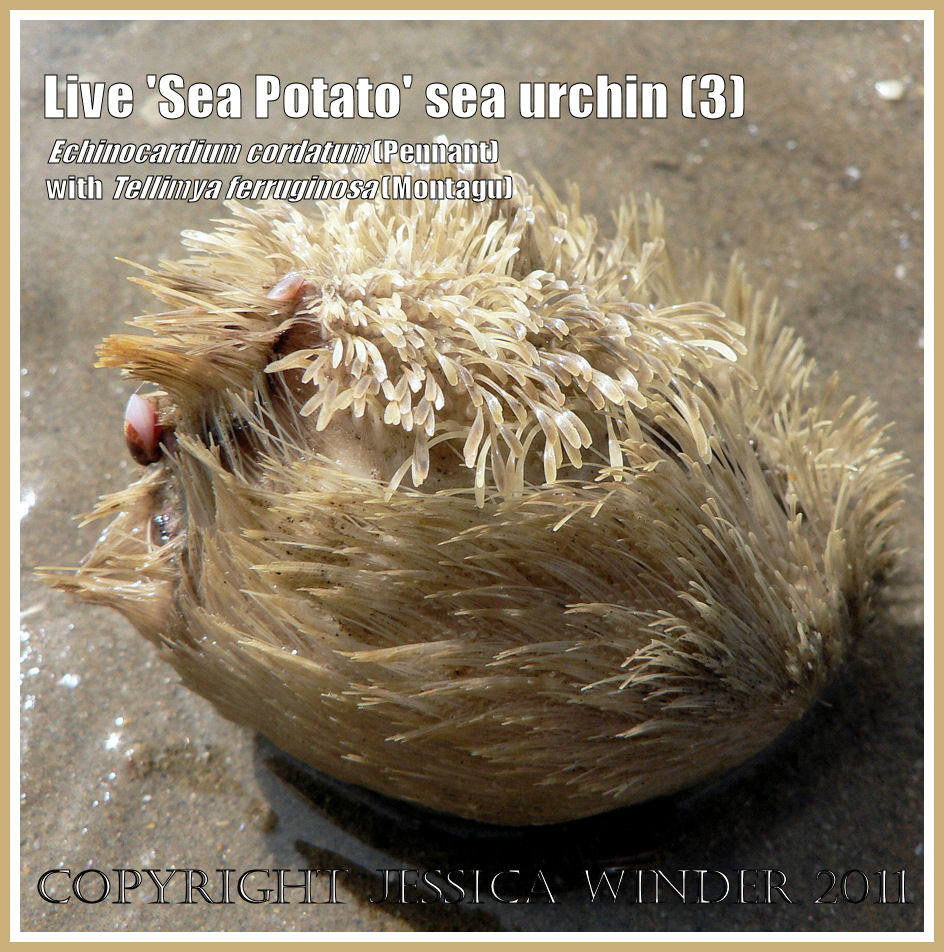 The Sea Potato, Echinocardium cordatum (Pennant), is also known as the Heart Urchin – partly because of the overall shape of the test but also, surely, because of the heart-shaped patch of specialised spines on its oral or lower surface. You can see this clearly in the above picture where the animal is lying upside down on the sand with its back end towards the left of the picture.