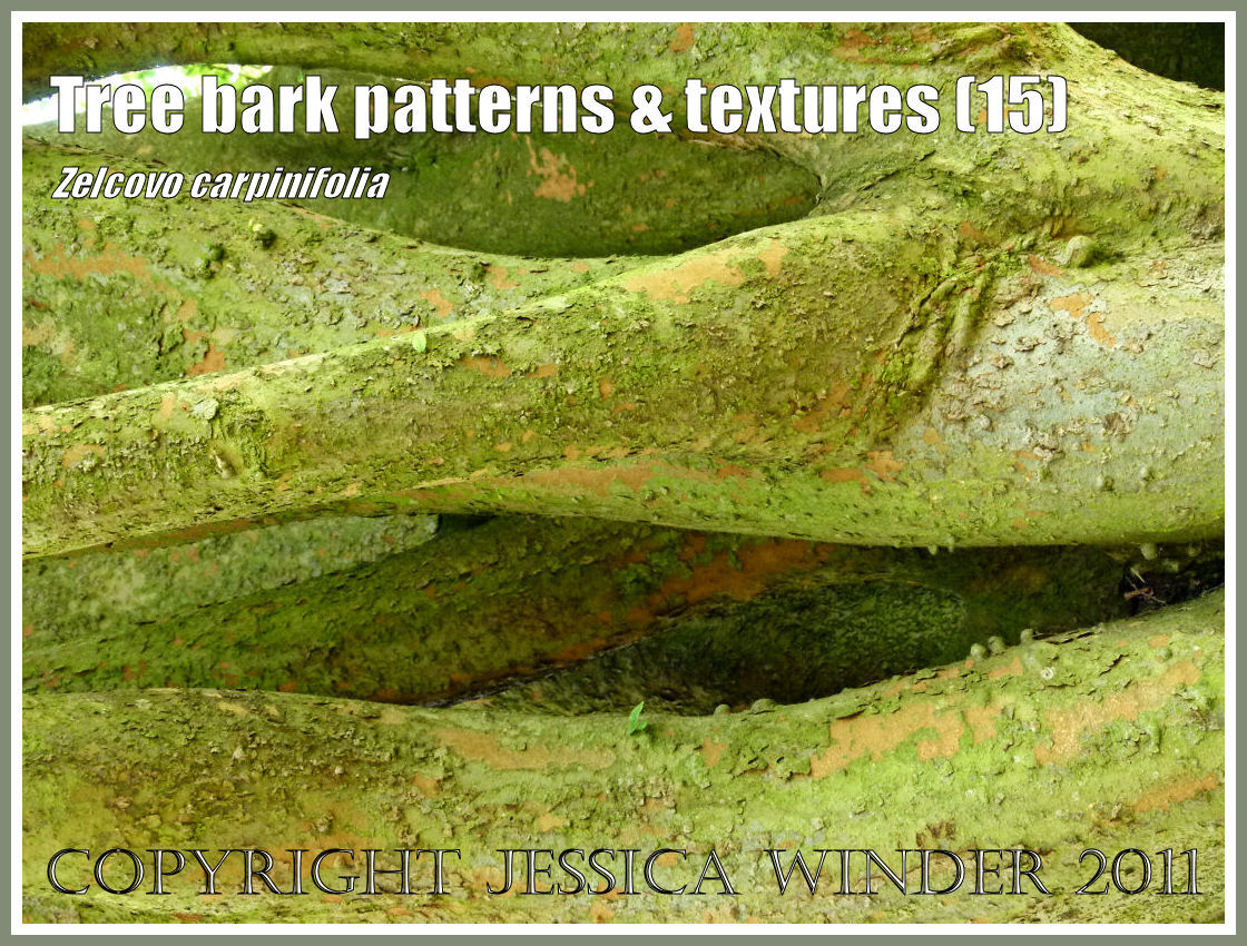 The Caucasian Elm has been introduced to Britain from a region between Europe and Asia. It grows to a fair height but the trunk or bole of the tree is short, usually less than 2 metres high. It then characteristically and unusually divides up into numerous vertical branches. The bark is relatively smooth with a bit of flaking; and in these pictures is bright green from a covering of alga.