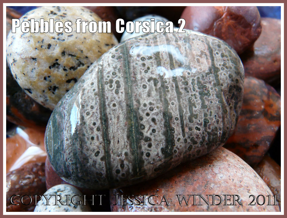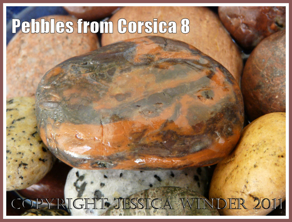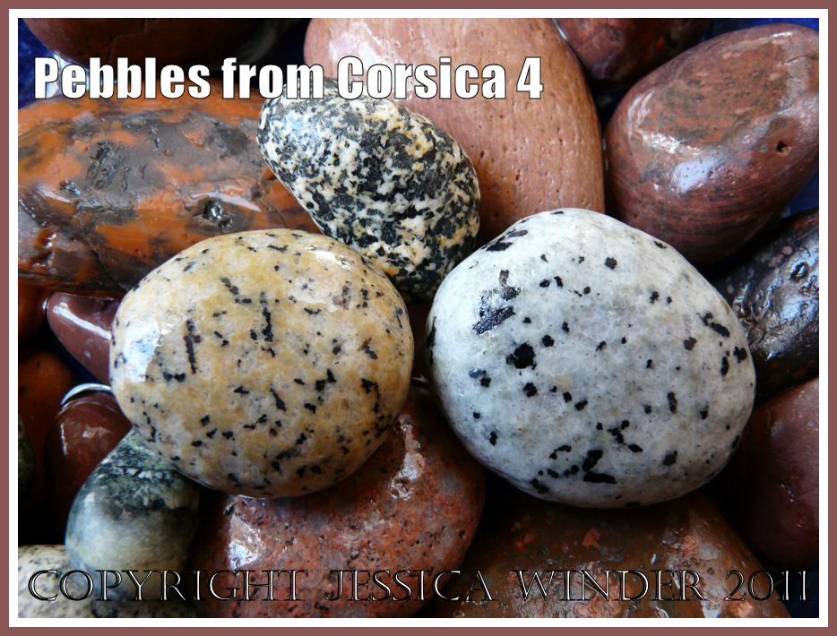 The pebbles in my pictures were picked up on a beach on the island’s western shore; and many no doubt are igneous rocks that were brought there by rivers flowing downstream from the Spelunca Gorge – which is famous for its red granitic cliff faces.
