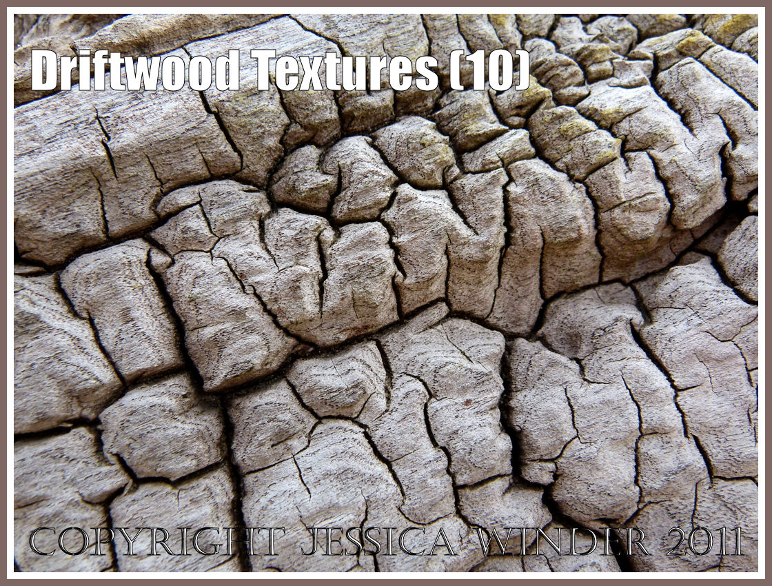 These photographs illustrate the gradual weathering, eroding, effect of the elements on driftwood that remains mostly above the high tide line. Cracks appear as the wood dries out and starts to decompose. The cellular structure becomes more apparent as the softer organic components disappear leaving the lignified cells – the driftwood ‘skeletonises’ on a microscopic scale. Growth bands become more prominent. Lichens begin the colonise the bare surfaces of the driftwood. The texture becomes more elaborate and the inherent patterns in the wood are emphasised.