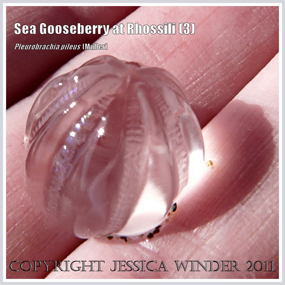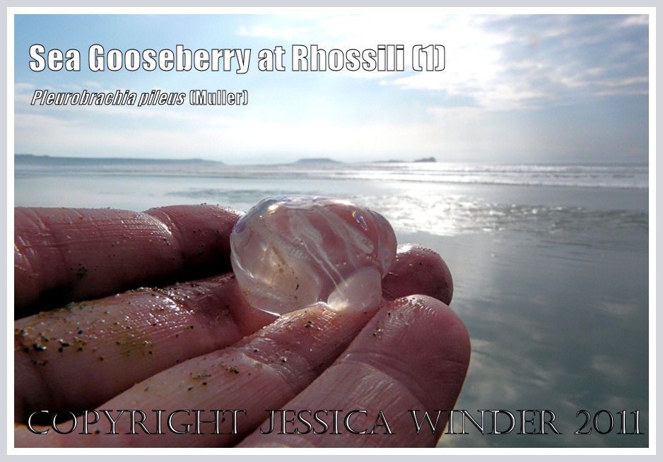 Holding a Sea Gooseberry, Pleurobrachia pileus (Muller), up to the light to see the internal organs. Through the transparent jelly you can see the retracted tentacles. The rows of “combs” are visible on the outer surface running from the oral (mouth) to the aboral surface. Quite a few of these creatures wash up with the incoming tide at Rhossili Bay, Gower. In the background of the picture you can just see the Worms Head.
