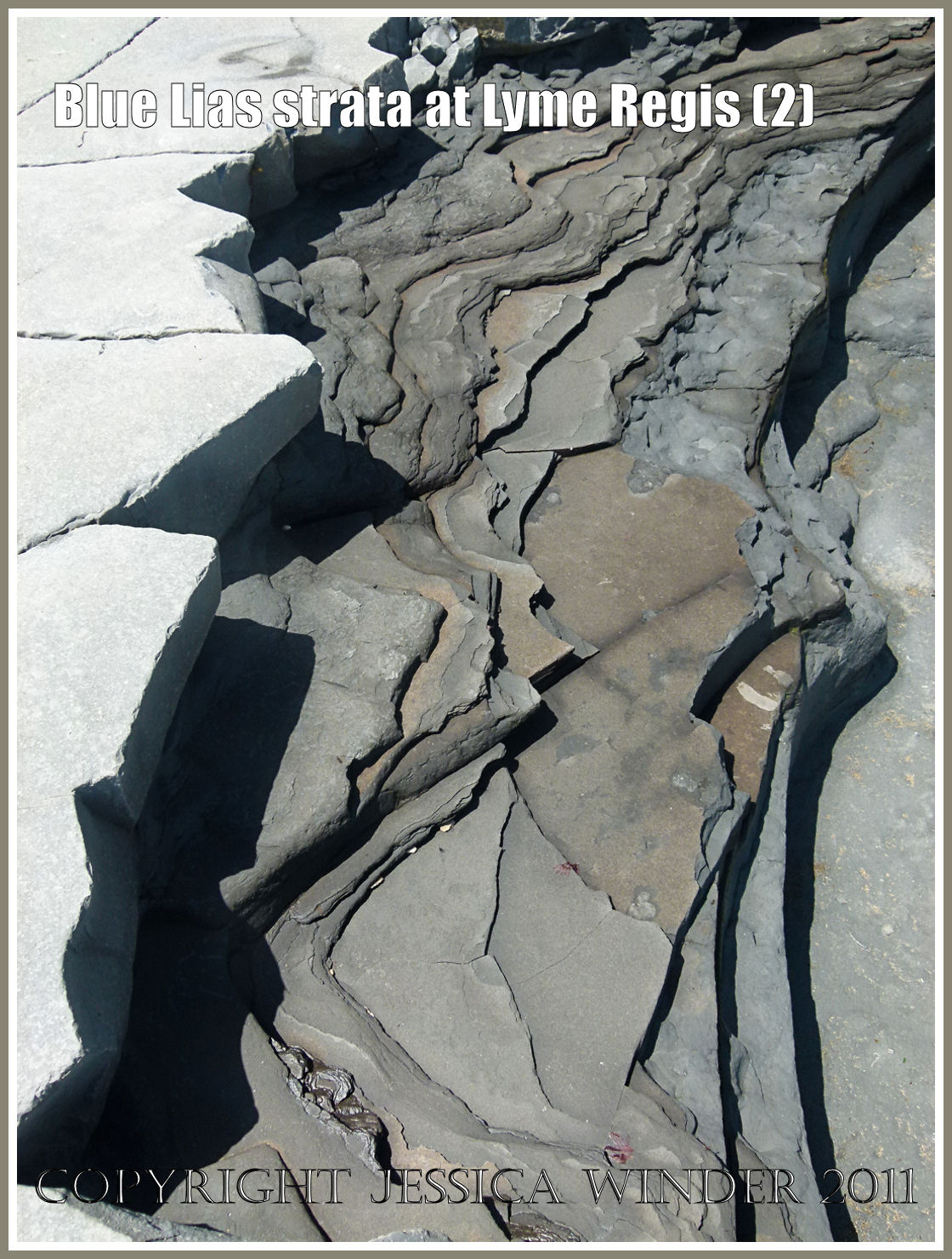 The greater part of the cliffs on Monmouth Beach at Lyme Regis in Dorset, UK, on the Jurassic Coast, are made up of the Blue Lias sediments laid down in the Lower Jurassic Period. They are composed of alternating layers of hard pale limestone and softer, finely-bedded, shales and mudstones. The rocks of the cliff face are rapidly eroding back. Wave action and weathering wear away the softer layers so that the harder rocks above them are no longer supported and this leads to frequent falls of the stone down to the shore below.