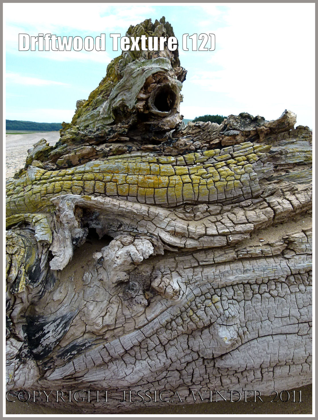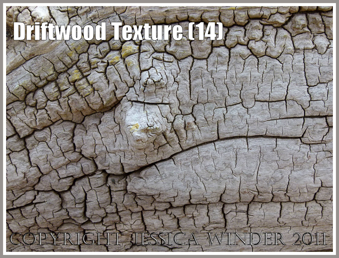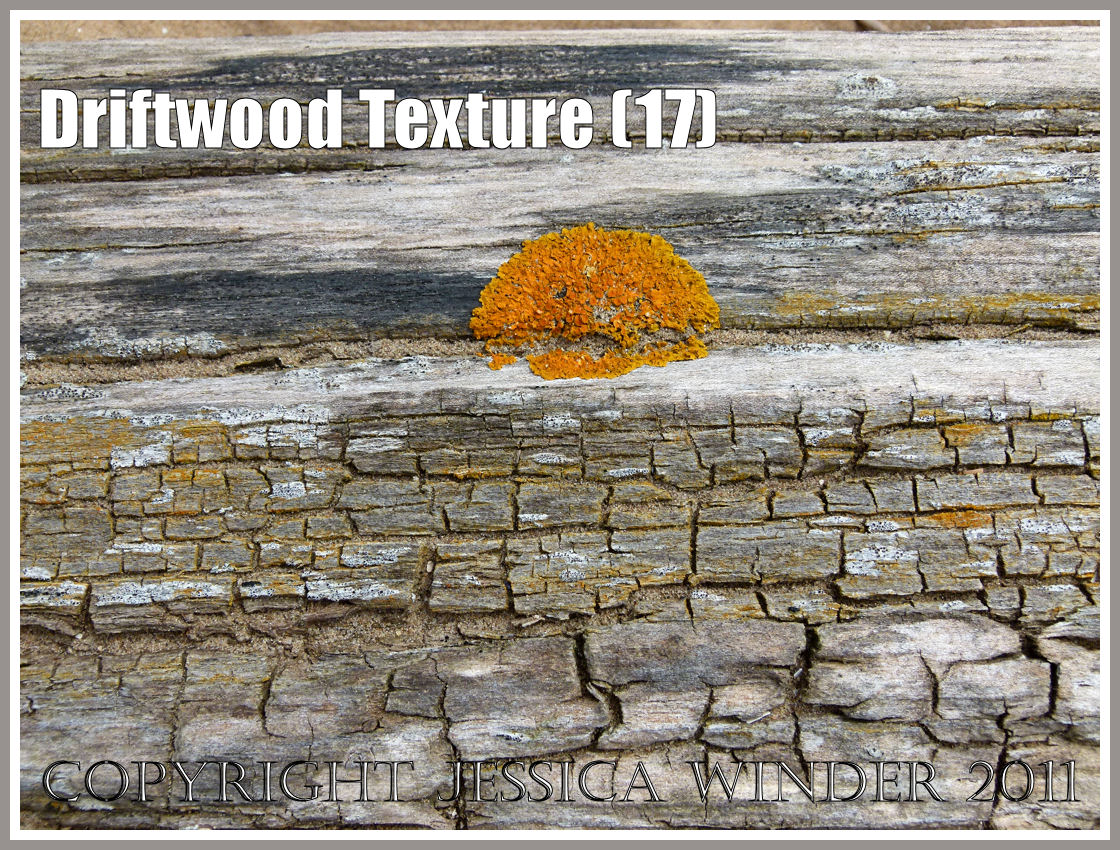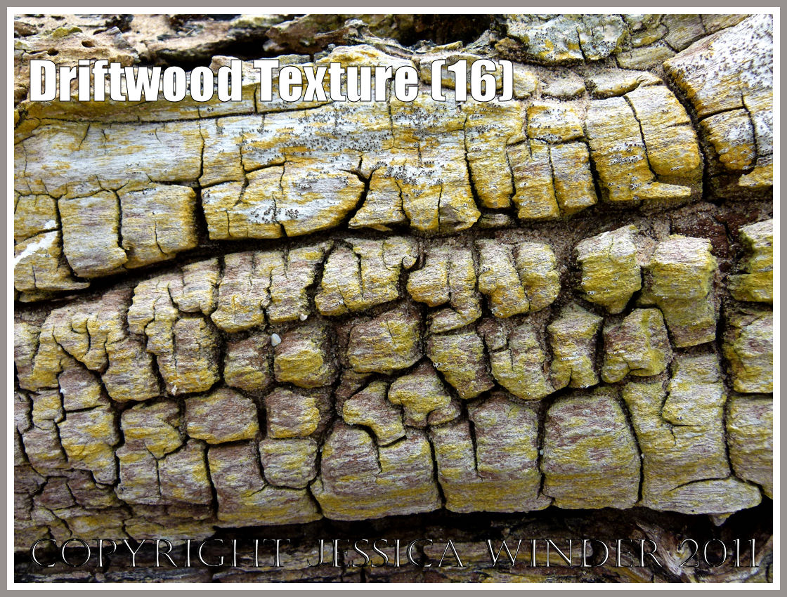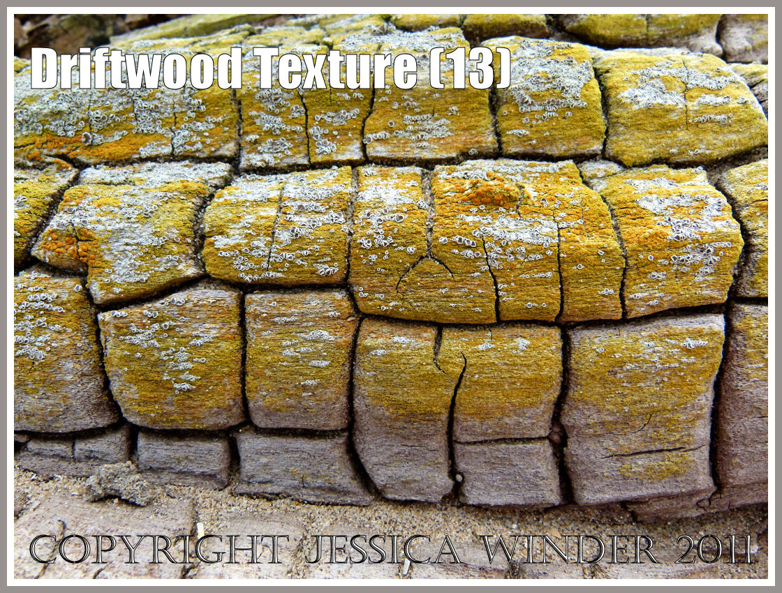 As wood decays, it starts to crack and craze. This driftwood on the strandline at Whiteford Sands has been stuck above the high tide line so long it has taken on an almost reptilian texture as it dessicates; and has also acquired a decorative encrustation of yellow lichen.