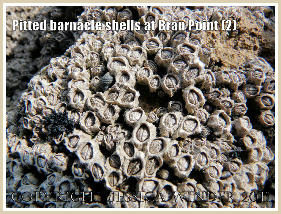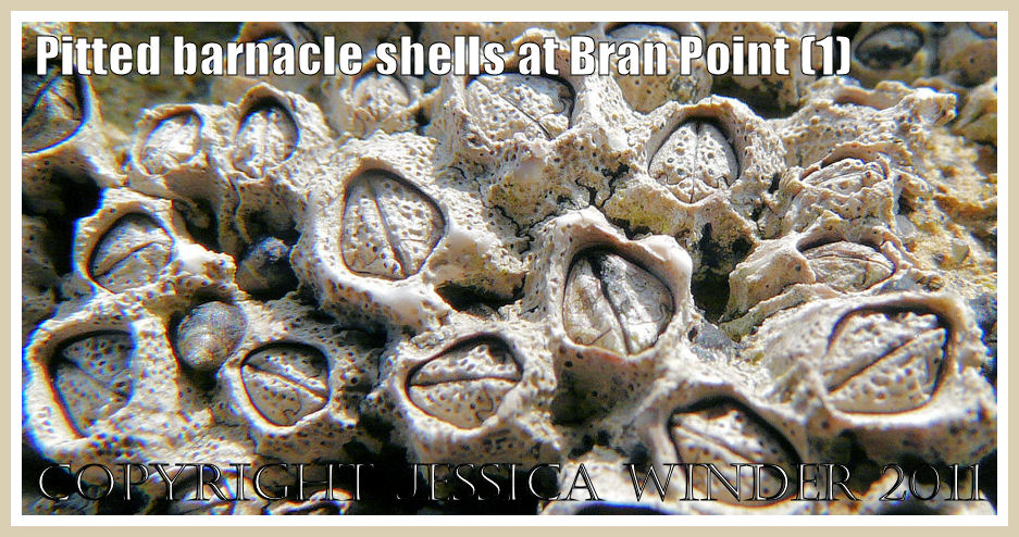 Incredible sculpturings and pittings are revealed in this close-up of barnacle shells. This sort of barnacle is known as Chthamalus montagui Southward and encrusts the rocky ledge of Bran Point at Ringstead Bay in Dorset. The species is characterised by the kite-shaped opening and the shape of the four plates (terga and scuta) that make up the operculum or lid. What really intrigued me was the pit marks on the shells. These are not normal. I looked in the literature but could only find references to regular growth ridges and rows of pits on the opercular plates: that didn’t seem to fit the bill.