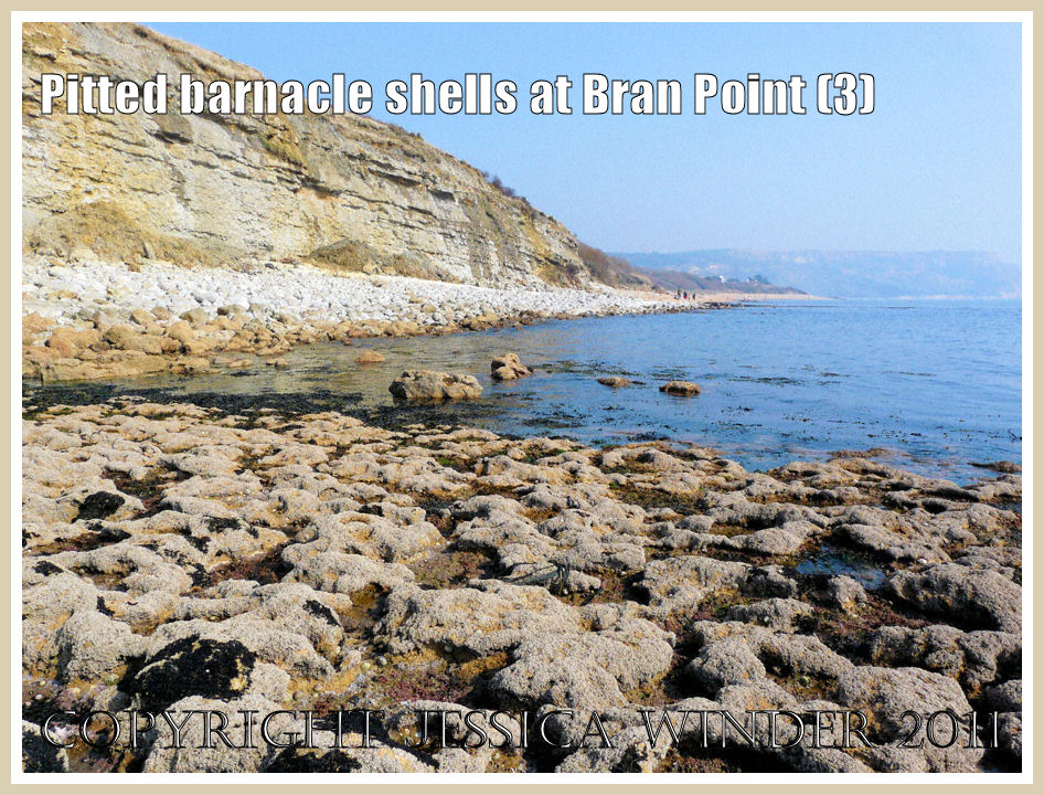 Pictured above is a general view of the encrusting layer of Chthamalus montagui barnacles. The photograph below shows the view from the same barnacle-encrusted rocky ledge of Bran Point looking eastwards acrross Ringstead Bay.