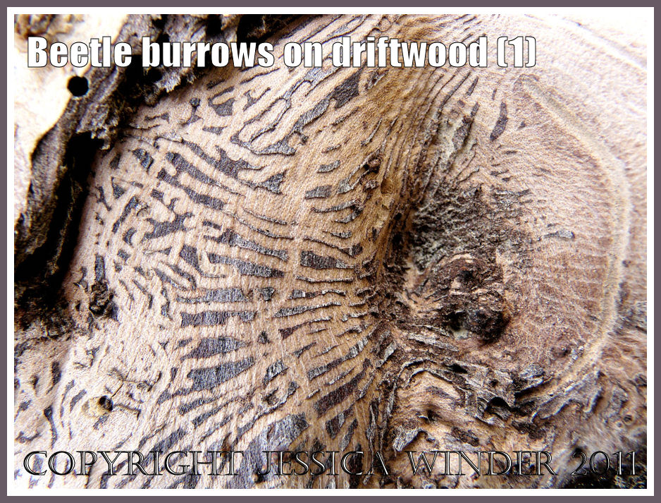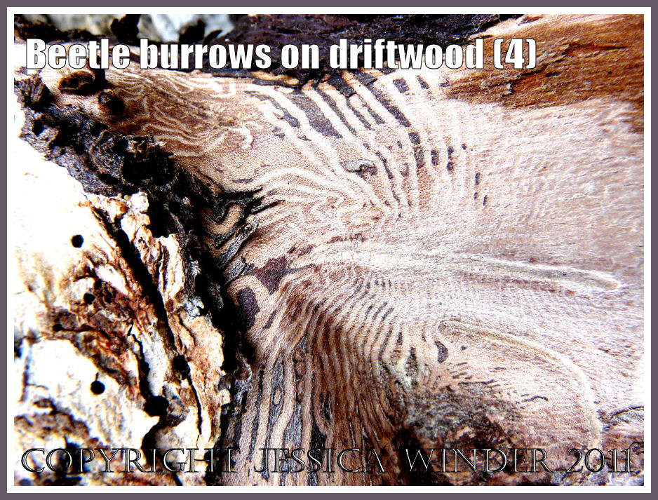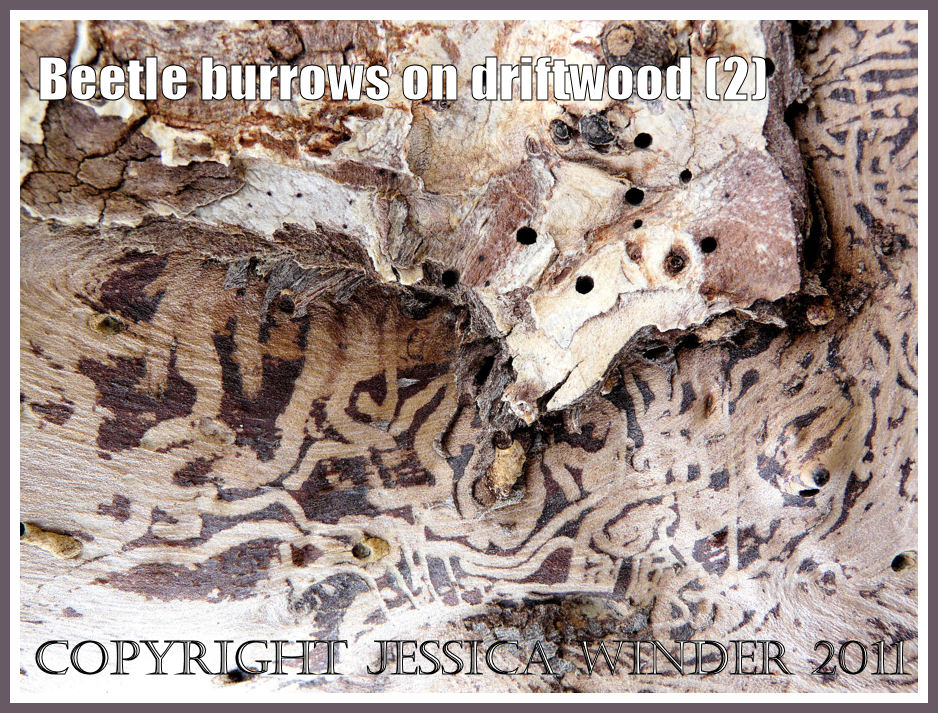 A closer examination revealed that they were the remains of tunnels created by beetle larvae eating their way along under the bark of the dead tree. Where some bark survived, there were neat bore-holes showing the place that the newly adult insects had emerged.