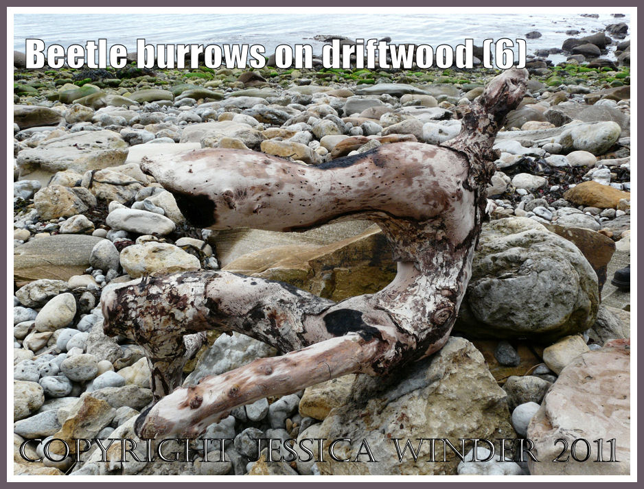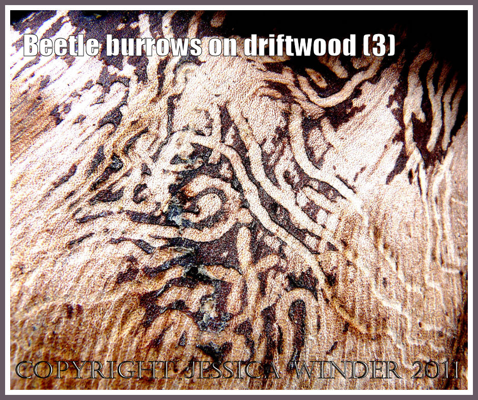 I am not sure what sort of beetle was responsible for these particular burrows but I’ve read that certain terrestrial Staphylinid Rove Beetles of the Bledus genus rely on sea-soaked timber on the seashore for laying their eggs.
