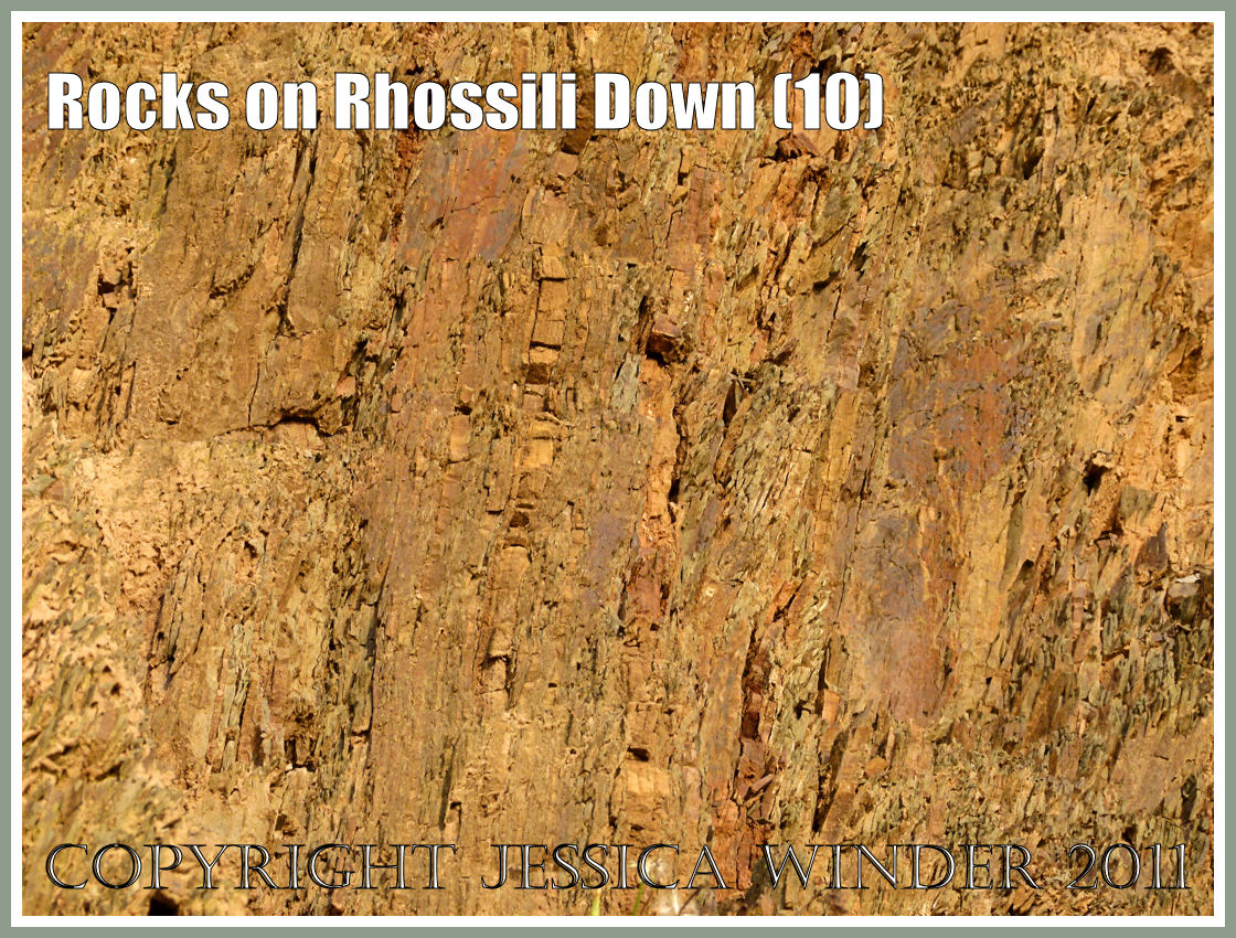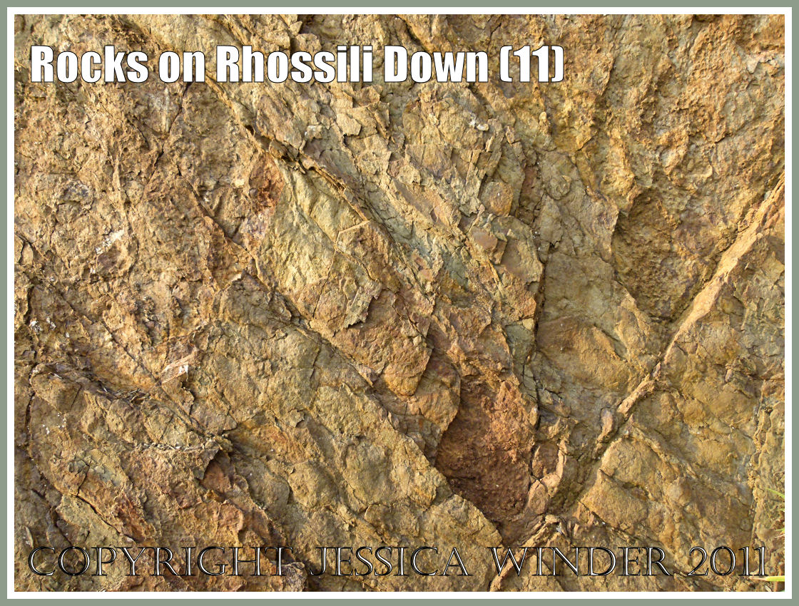The photographs in this post illustrate the patterns and textures created by this rock formation as it crumbles away with weathering. The pictures also show the almost vertically aligned rock strata as they are seen in end-on view in the southern part of the exposure, as well as the flat-on view of the bedding planes as they are seen in the north part of the exposure. The green/grey and ferruginous colours result from contamination during the shallow water formation of these sediments by incoming terrestrial materials from a nearby land surface.