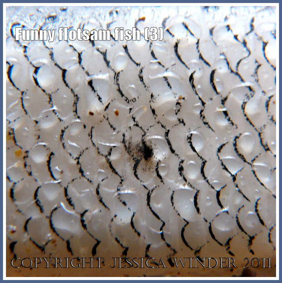 This funny, flippy-floppy silicone rubber fishing lure was found on the strandline at Whiteford Sands. It’s very realistic. It has great googly eyes and even the scales are painted on the body. It feels wet and sticky and wobbles when you pick it up. Originally it was lying amongst empty dark blue mussel shells on the wet sand. I couldn’t resist picking it up and taking it home. Now it resides in the bright blue bowl of beach-combed shells on my window sill.