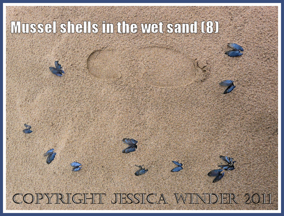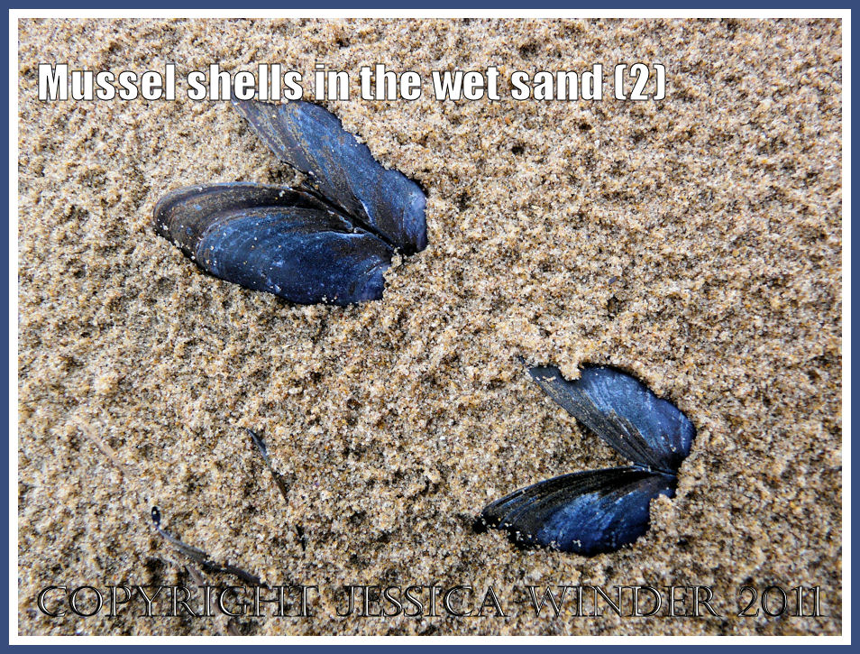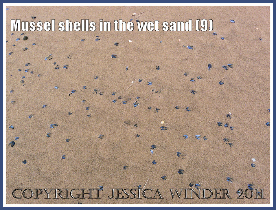 Mussels grow naturally and in great abundance in this area, settling on all sorts of substrates (even thin strands of seaweed) from which they are easily dislodged. This is great for the mussel gatherers who rake them up into sacks when the beds are exposed on very low tides. However, strong waves and stormy weather can tear them from their attachment. I have been told that on one occasion the mussel shells were knee deep on the strandline.